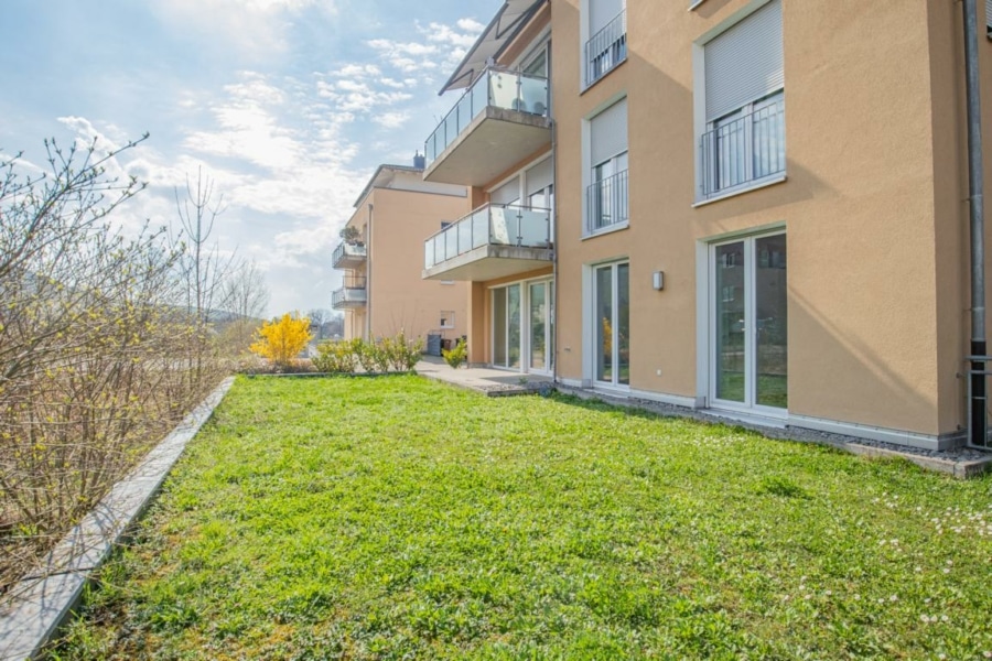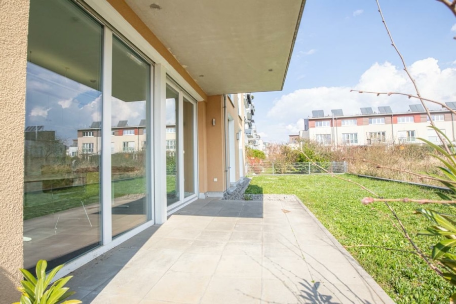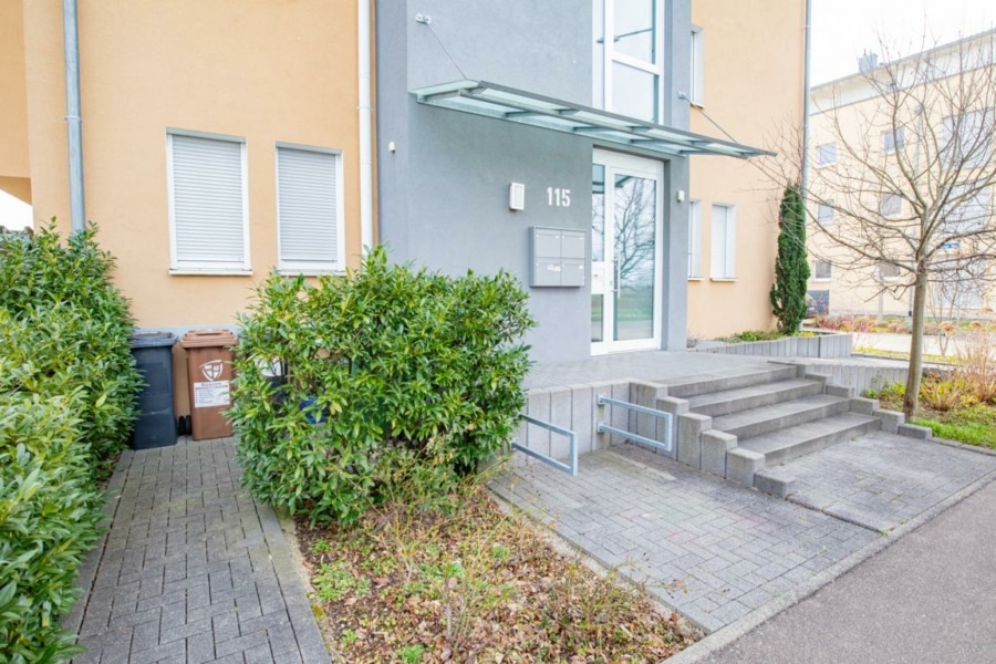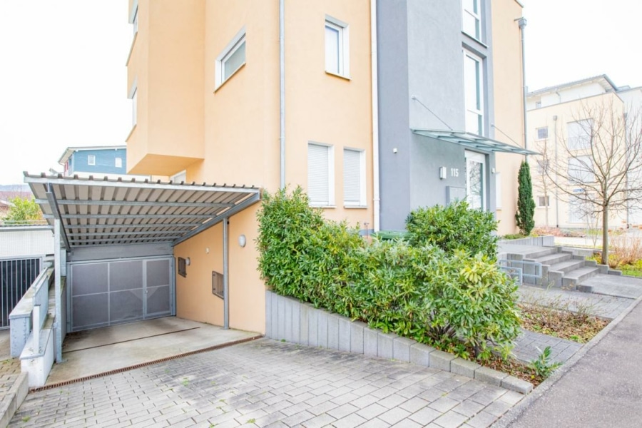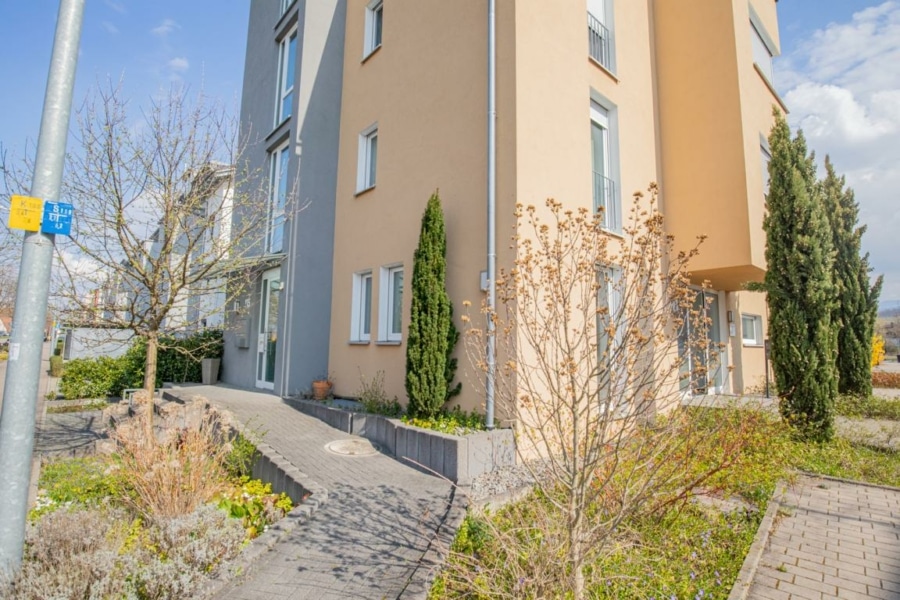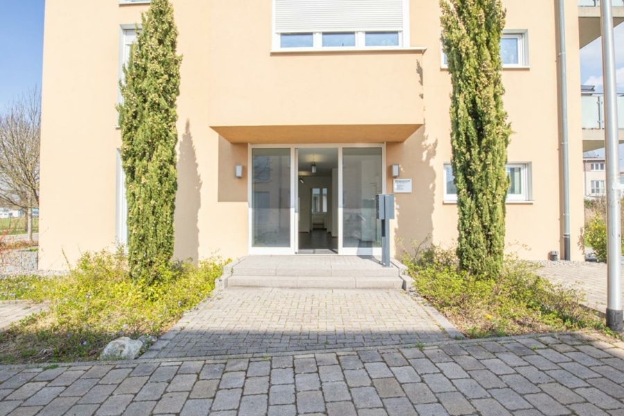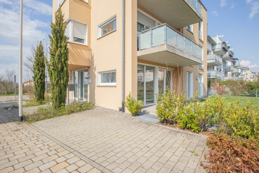 Die Einheit befindet sich im Erdgeschoss eines kleinen, gepflegten Mehrfamilienhauses aus dem Jahr 2012 in Freiburg-St. Georgen. Der Zugang erfolgt über einen separaten Eingang an der Hausseite zu den Parkplätzen oder über den Haupteingang des Hauses.