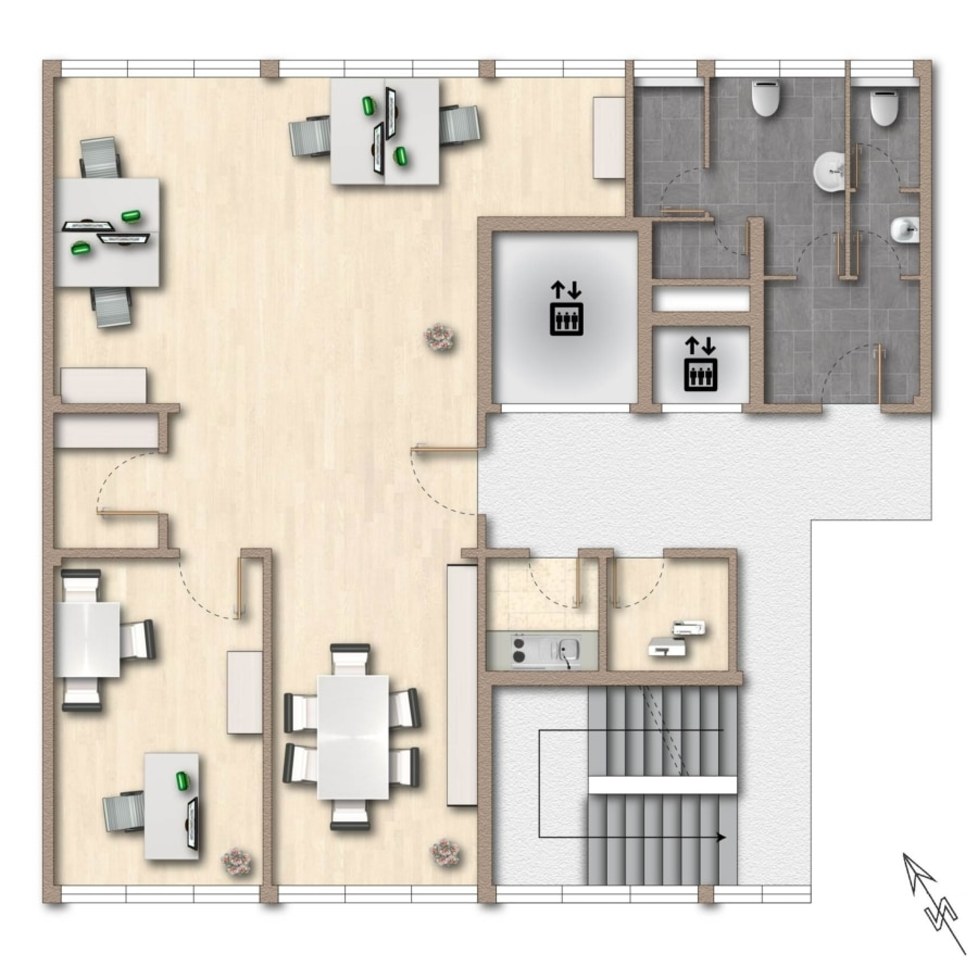 Die großzügige Büroetage im 1. Obergeschoss bietet ca. 115 m² Nutzfläche und eignet sich für vielfältige Geschäftsmodelle.