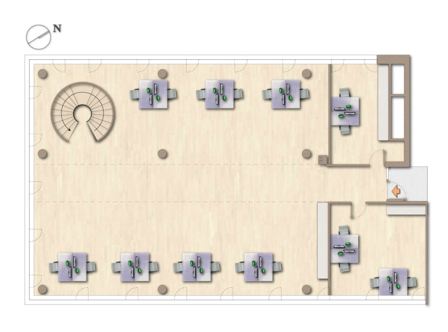 Das offene und flexible Raumkonzept ermöglicht eine individuelle Gestaltung der gesamten Fläche. Die Büros werden derzeit im Open-Space-Stil genutzt und fördern durch flexible Arbeitsplätze die Zusammenarbeit und Kommunikation. Gleichzeitig sind die Arbeitsbereiche sinnvoll gegliedert und bieten Ruhezonen, Besprechungsräume sowie Einzelbüros. Ergänzt wird das Raumangebot durch mehrere großzügige Sanitärräume, eine Aufenthaltsküche mit Balkon und Technikräume.