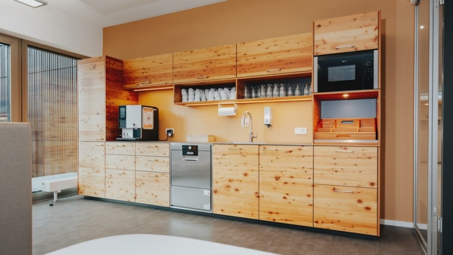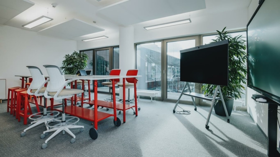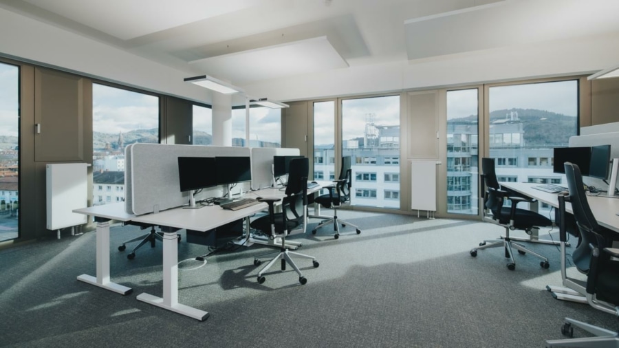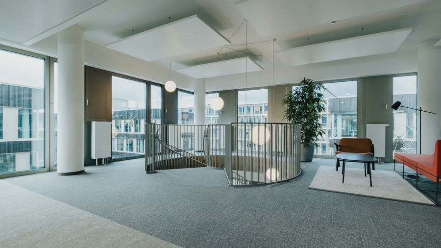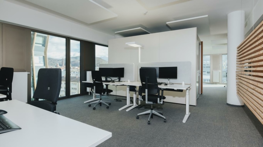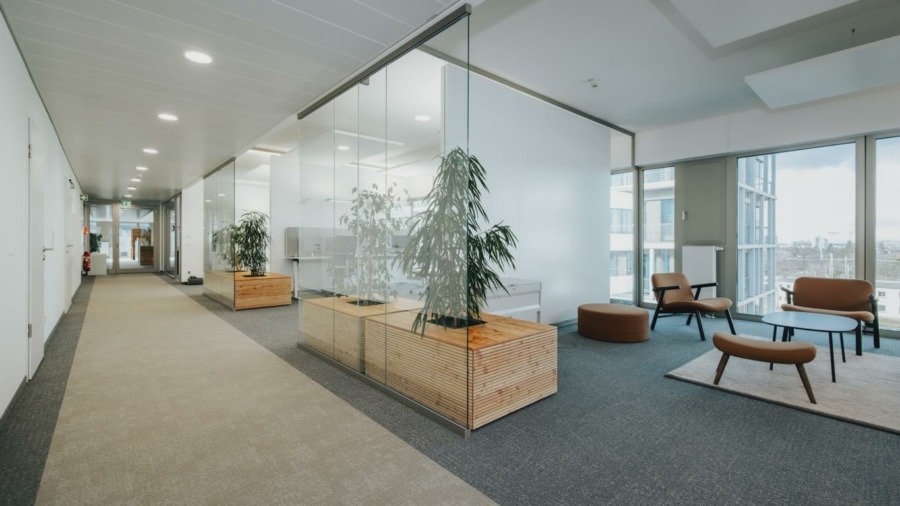 Das offene und flexible Raumkonzept ermöglicht eine individuelle Gestaltung der gesamten Fläche. Die Büros werden derzeit im Open-Space-Stil genutzt und fördern durch flexible Arbeitsplätze die Zusammenarbeit und Kommunikation. Gleichzeitig sind die Arbeitsbereiche sinnvoll gegliedert und bieten Ruhezonen, Besprechungsräume sowie Einzelbüros. Ergänzt wird das Raumangebot durch mehrere großzügige Sanitärräume, eine Aufenthaltsküche mit Balkon und Technikräume.