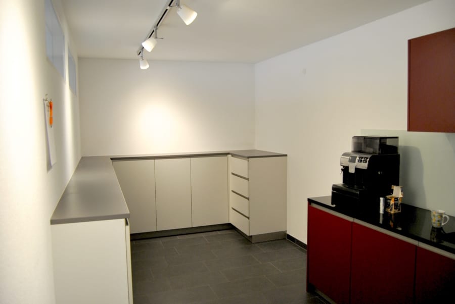 Die modern sanierten Büroräume im Erdgeschoss bieten ein durchdachtes und funktionales Raumkonzept. Praktische Einbauschränke und große Fensterfronten sorgen für eine optimale Belichtung, während Außenjalousien an sonnigen Tagen für angenehme Beschattung sorgen. Eine vom Vermieter eingebaute Teeküche sowie gepflegte Sanitärräume runden das Angebot ab. Als Bodenbeläge wurden Fliesen und Teppichboden verwendet.