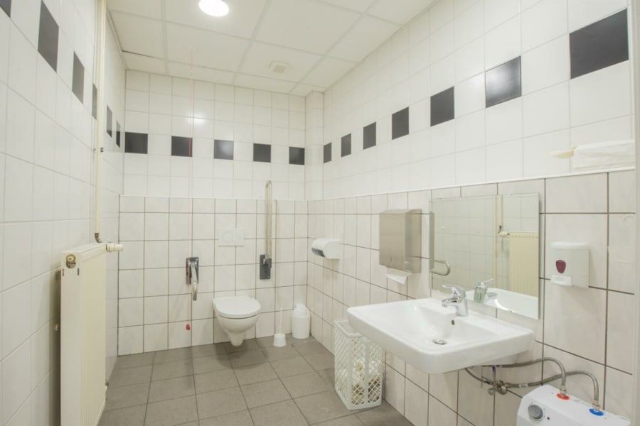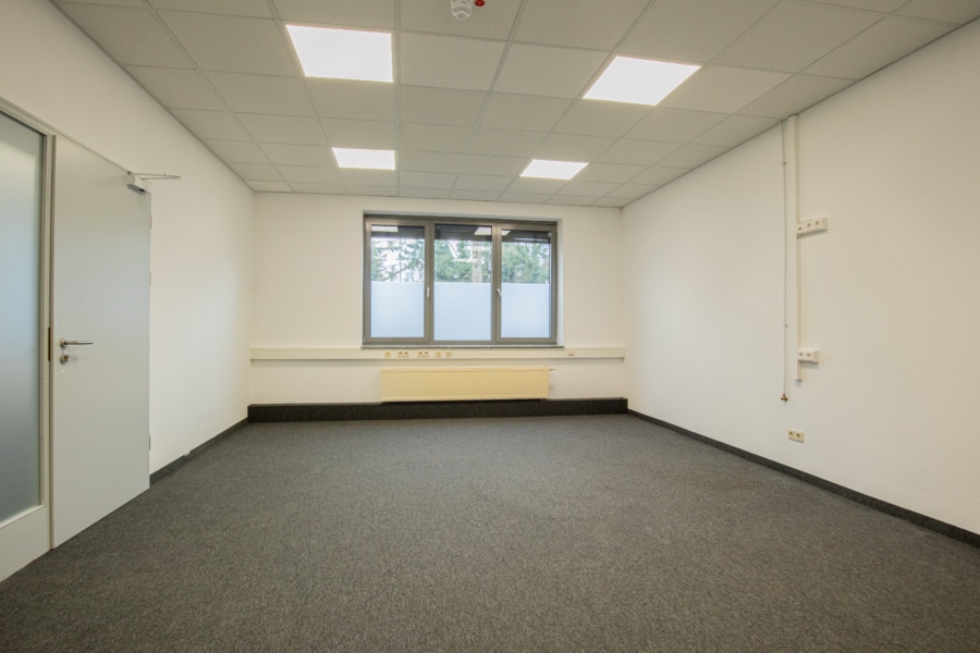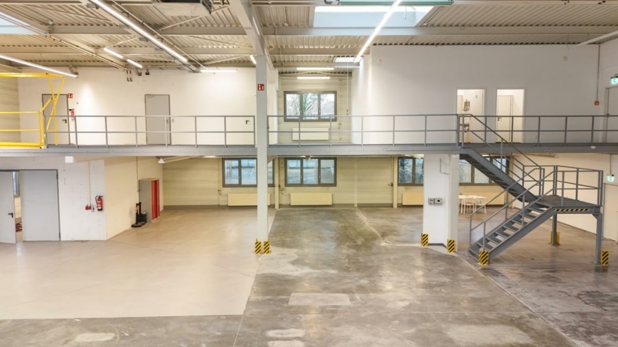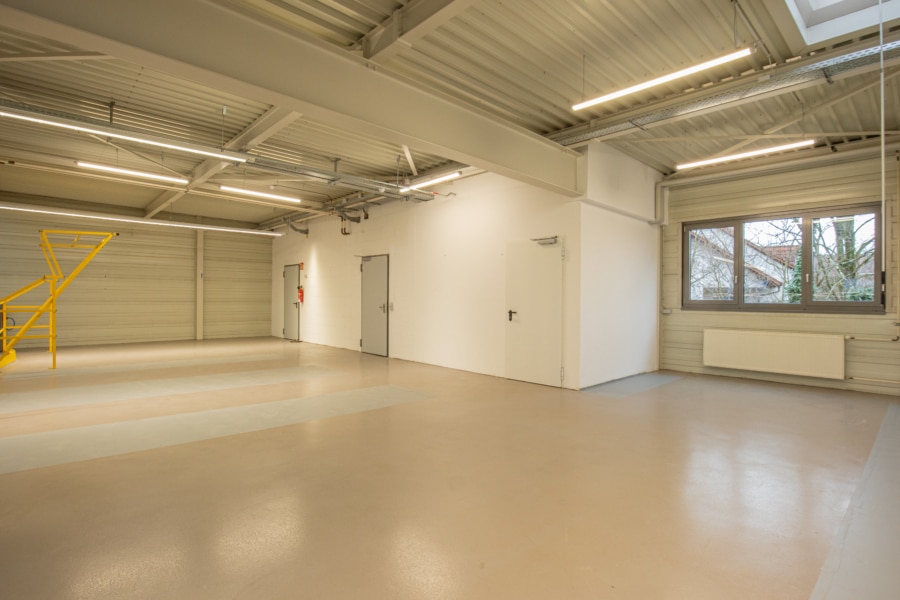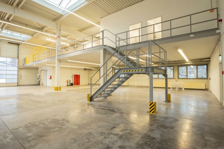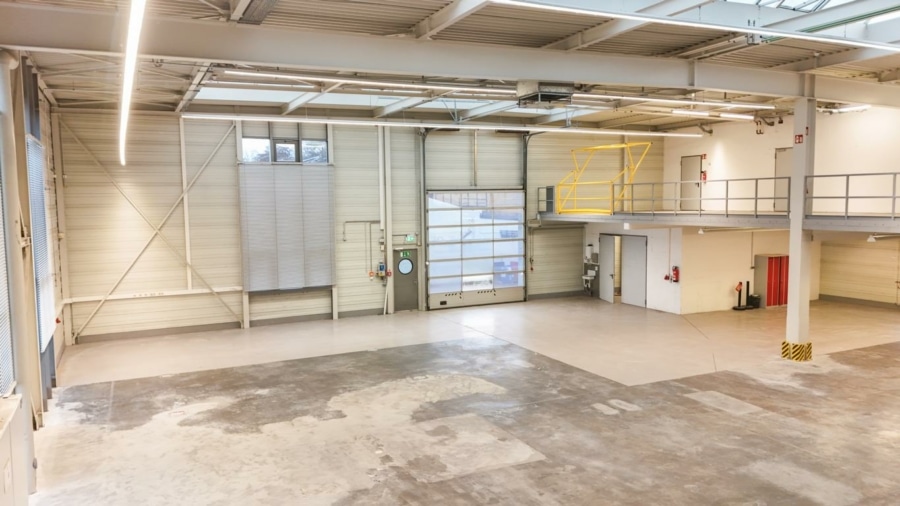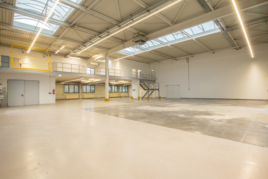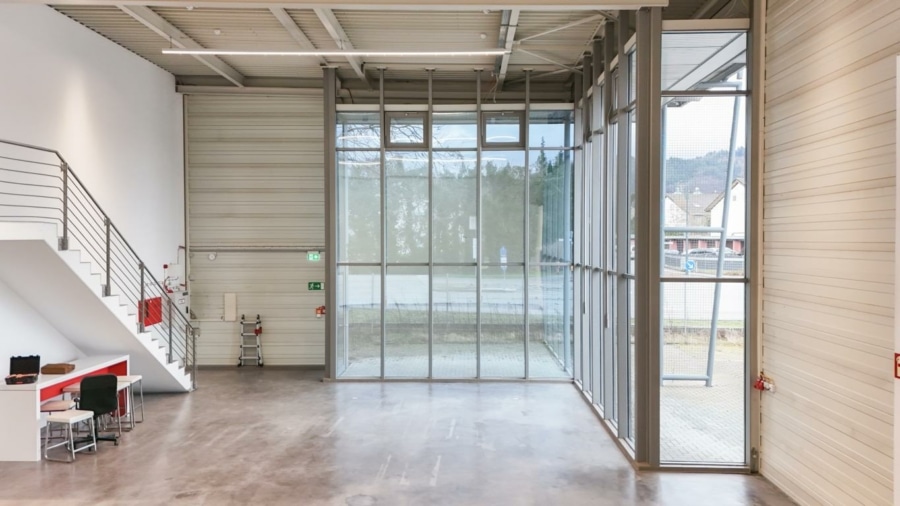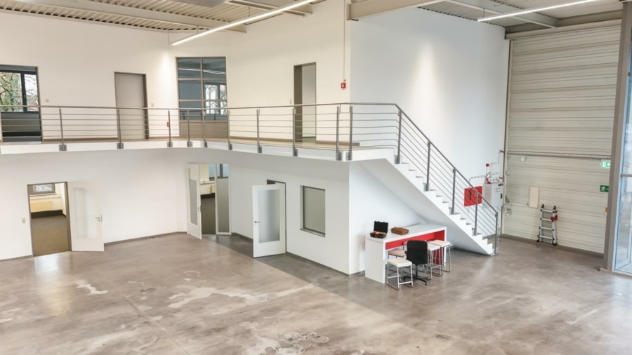 Ein Rolltor gewährleistet eine optimale Anbindung an die Halle. Derzeit ist ein Teil der Fläche im Obergeschoss durch eine Stahltreppe verbunden, ebenfalls lässt sich diese Fläche mit einem Gabelstapler seitlich beladen. Auf dieser Ebene befinden sich weitere Büroräume mit Sanitär- und Umkleideräume, die Zentralheizung sowie die EDV-Technik. Die sonnenexponierten Räume verfügen über außenliegende Jalousien.