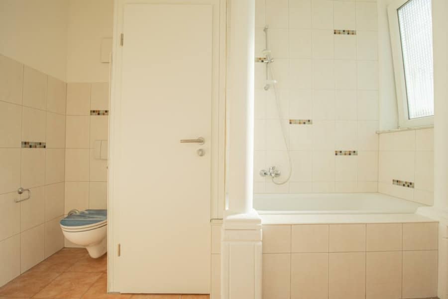 Das Tageslichtbad überzeugt mit Duschbadewanne, Waschmaschinenanschluss und WC. Das Schlafzimmer bietet einen ruhigen Rückzugsort mit viel Tageslicht und einem Blick ins Grüne.