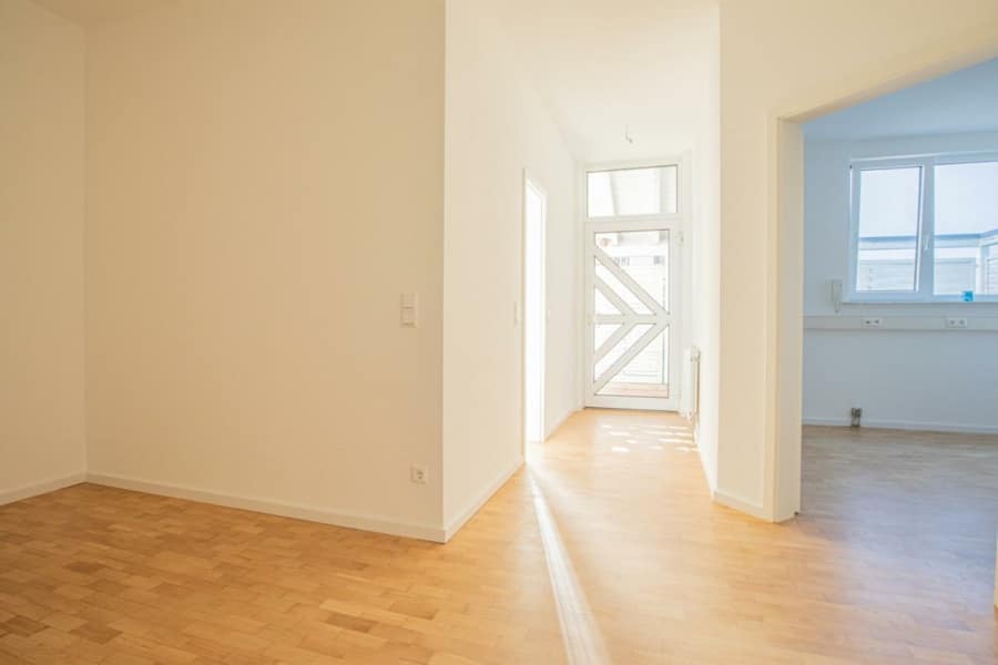 Bereits beim Betreten spüren Sie die angenehme Atmosphäre des Hauses. Der zentrale Flur bietet eine Abstellnische, die sich ideal als begehbarer Kleiderschrank oder Ankleide eignet und führt Sie direkt in den offenen Koch- und Essbereich. Hier lässt sich das tägliche Leben genießen – ob beim Kochen in der Küche oder beim gemeinsamen Essen. Das gemütliche Wohnzimmer lädt zum Entspannen ein und bietet direkten Zugang auf die Terrasse.