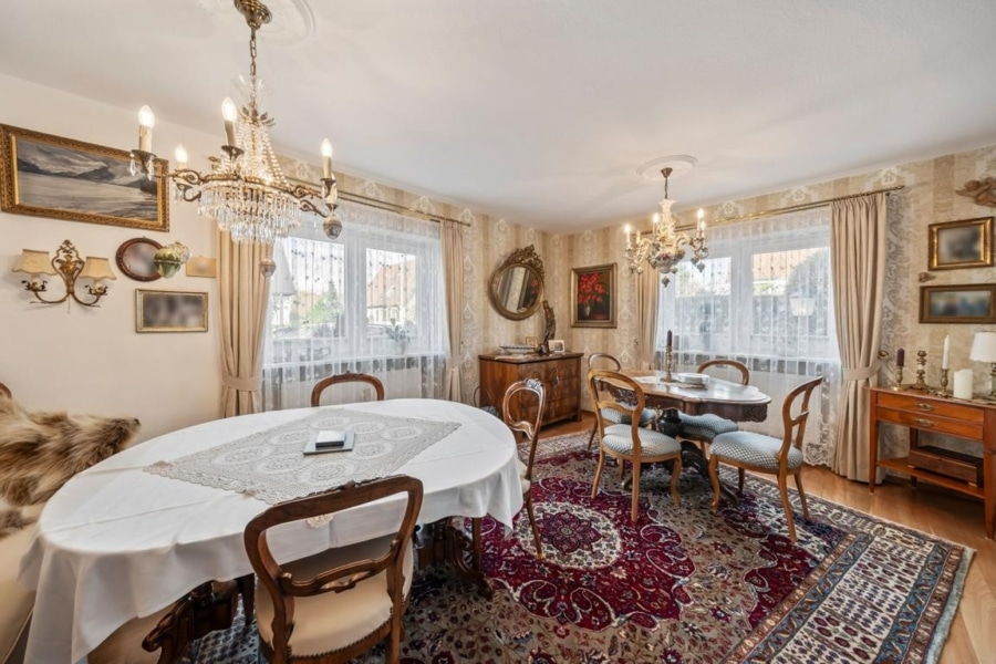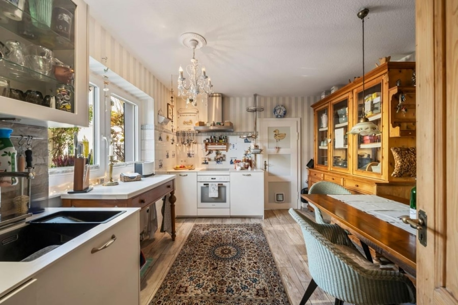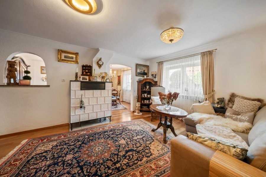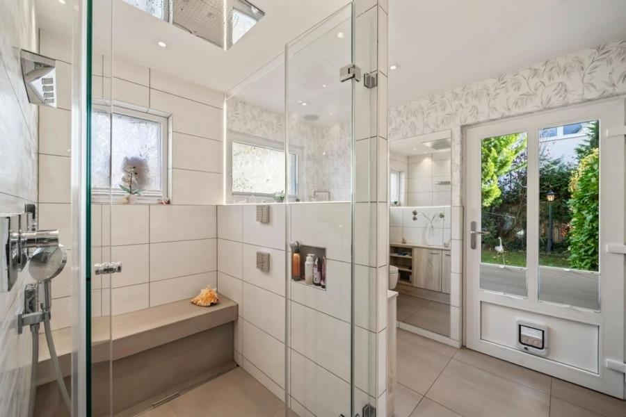 Im Erdgeschoss befindet sich ein großzügiges Wohn- und Esszimmer mit einem wunderbaren Kachelofen. Der Raum ist durch einen Türbogen und eine Durchreiche optisch voneinander getrennt. Über den zentralen Flurbereich gelangen Sie in die Küche mit integrierter Einbauküche und ausreichend Platz für eine Sitzmöglichkeit. Das angrenzende Tageslichtbadezimmer wurde im Jahr 2023 umfangreich saniert. Es bietet Ihnen eine bodentiefe Dusche mit Sitzbank, zahlreiche Lichtelemente, ein WC mit integrierter Bidetfunktion sowie einen Anschluss für die Waschmaschine. Das Badezimmer verfügt über einen direkten Zugang auf die überdachte Terrasse und in den Garten.