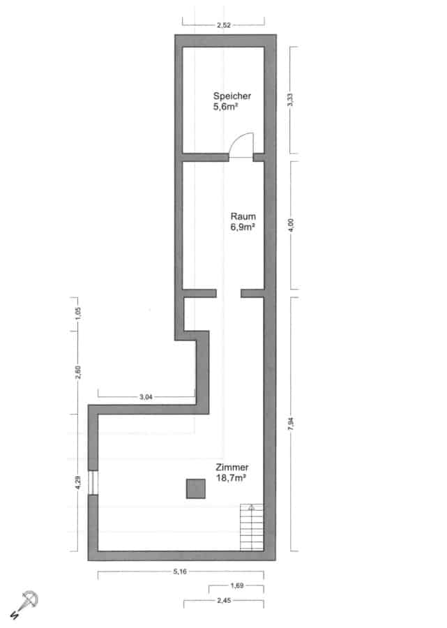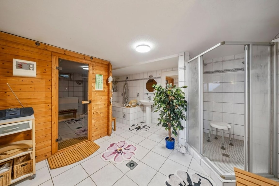 Der Zugang zum Untergeschoss erfolgt sowohl über eine innenliegende Treppe als auch über eine Außentreppe unterhalb des Eingangsbereichs. Hier befindet sich auf ca. 40 m² Nutzfläche der Wellnessbereich nebst Sauna und der Heizungs- und Technikraum.