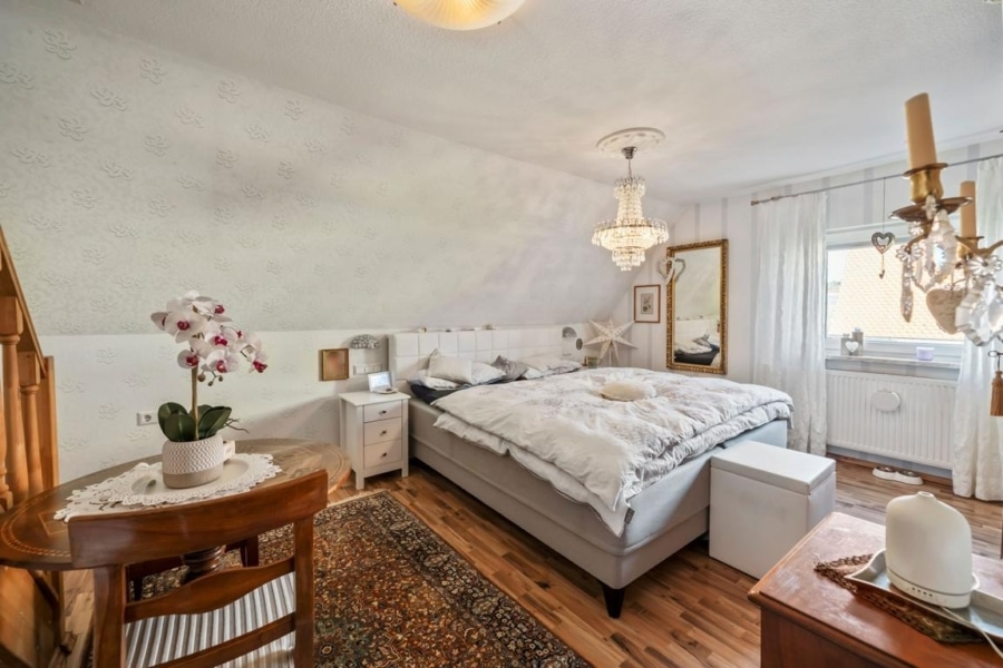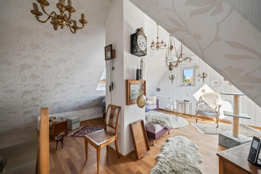 Das ausgebaute Dachgeschoss erreichen Sie über eines der Schlafzimmer oder die Dachbodentreppe. Hier erwartet Sie ein großzügiges Dachstudio mit Zugang zu weiteren Räumen, die sich ideal als Stauraum oder kreative Nutzflächen eignen. Das Dachstudio besticht durch seine Gemütlichkeit mit einem geschmackvollen Parkettboden und mit Dachschrägen sowie Dachfenstern die einen schönen Lichteinfall bieten.