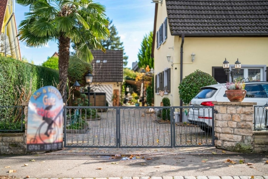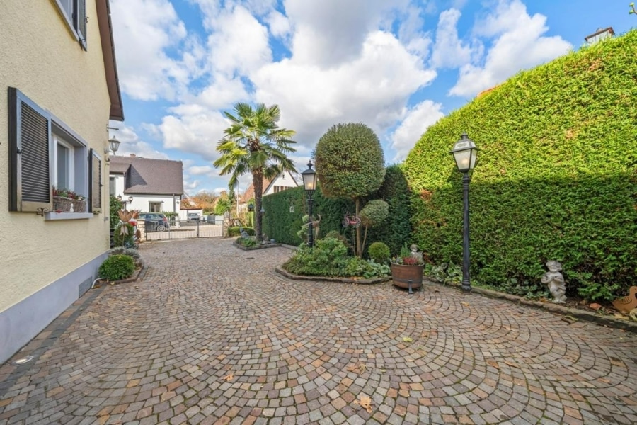 Über eine mit Natursteinen gepflasterte Einfahrt gelangen Sie zum Haus und in den überdachten Eingangsbereich des Hauses.
