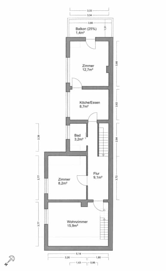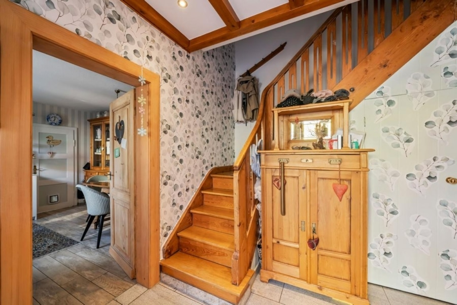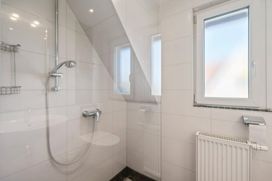 Über die Treppe im Flur erreichen Sie das Obergeschoss. Hier erwarten Sie zwei Schlafzimmer und ein möglicher Einliegerbereich mit einem Schlafzimmer, einem Badezimmer mit begehbarer Dusche, eine Küche mit Einbauküche und Essbereich sowie ein Balkon.