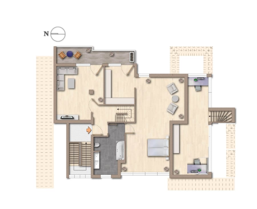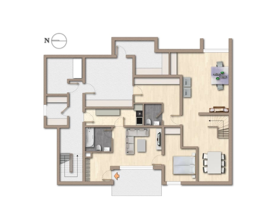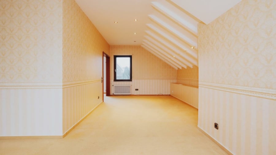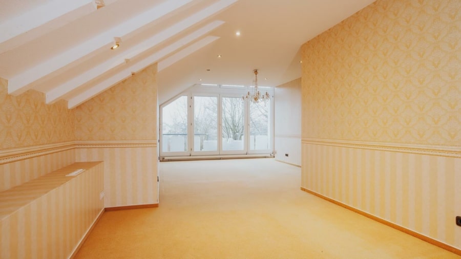 Im Dachgeschoss setzt sich das großzügige Raumkonzept fort: Ein weitläufiges Zimmer mit Balkon eröffnet individuelle Nutzungsmöglichkeiten wie Kinder- oder Arbeitszimmer, während das etwa 42 m² große Schlafzimmer mit angeschlossenem Ankleidebereich einen privaten Rückzugsort von bemerkenswerter Dimension bildet. Ein geräumiges Tageslichtbad rundet diese Wohnebene ab.