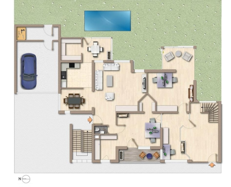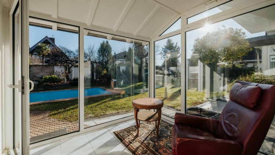 Die Hauptwohneinheit erstreckt sich über eine Wohn- und Nutzfläche von ca. 165 m² und vermittelt bereits beim Betreten ein offenes, lichtgeprägtes Raumgefühl. Mittelpunkt der Erdgeschossebene ist das helle Wohnzimmer mit großzügigen Fensterflächen, das fließende Übergänge zur Terrasse, in den harmonisch gestaltenden Garten mit Swimmingpool und naturnahmen Koiteich sowie in den Wintergarten bietet. Dieser erweitert den Wohnraum um eine sonnige, ganzjährig nutzbare Aufenthaltszone. Das angrenzende Esszimmer schafft eine harmonische Verbindung zur funktional geschnittenen Küche. Ergänzt wird diese Etage durch ein Gäste-WC sowie einen praktischen Abstellraum.