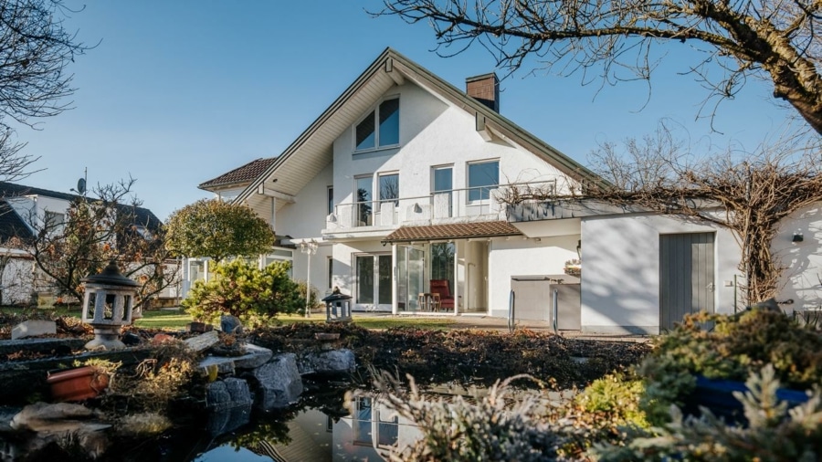 Der Außenbereich unterstreicht den besonderen Charakter der Liegenschaft: Liebevoll angelegte Gartenflächen, verschiedene Sitzplätze, ein Koiteich sowie ein Swimmingpool schaffen eine stimmungsvolle, geschützte Atmosphäre. Der gewachsene Baumbestand sorgt für Privatsphäre und verleiht dem Grundstück eine ruhige, nahezu abgeschirmte Wirkung.