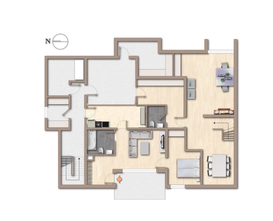 Die Hauptwohneinheit erstreckt sich über eine Wohnfläche von ca. 165 m² und vermittelt bereits beim Betreten ein offenes, lichtgeprägtes Raumgefühl. Mittelpunkt der Erdgeschossebene ist das helle Wohnzimmer mit großzügigen Fensterflächen, das fließende Übergänge zur Terrasse, in den harmonisch gestaltenden Garten mit Swimmingpool und naturnahmen Koiteich sowie in den Wintergarten bietet. Dieser erweitert den Wohnraum um eine sonnige, ganzjährig nutzbare Aufenthaltszone. Das angrenzende Esszimmer schafft eine harmonische Verbindung zur funktional geschnittenen Küche. Ergänzt wird diese Etage durch ein Gäste-WC sowie einen praktischen Abstellraum.