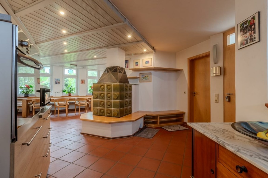 Die Immobilie besticht durch eine großzügige Wohnfläche von ca. 380 m². Beim Betreten empfängt Sie ein freundlicher Eingangsbereich, von dem aus Sie in die Diele gelangen. Das Herzstück der Etage ist das großzügige Wohnzimmer mit teilweise hohen Decken und einer Empore, die eine besondere Atmosphäre schafft. Ein gemütlicher Kachelofen spendet im Winter wohltuende Wärme.