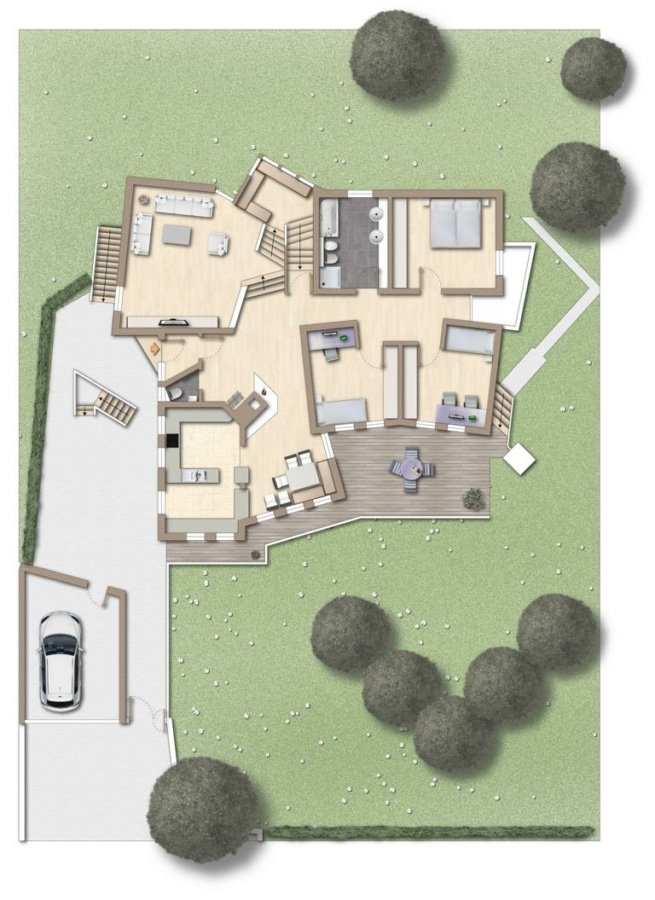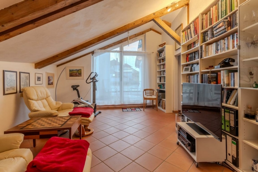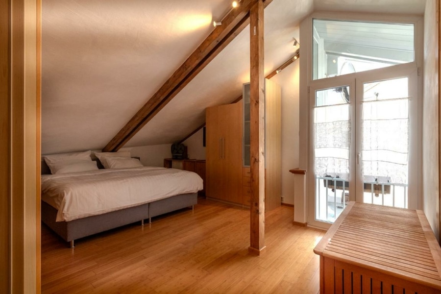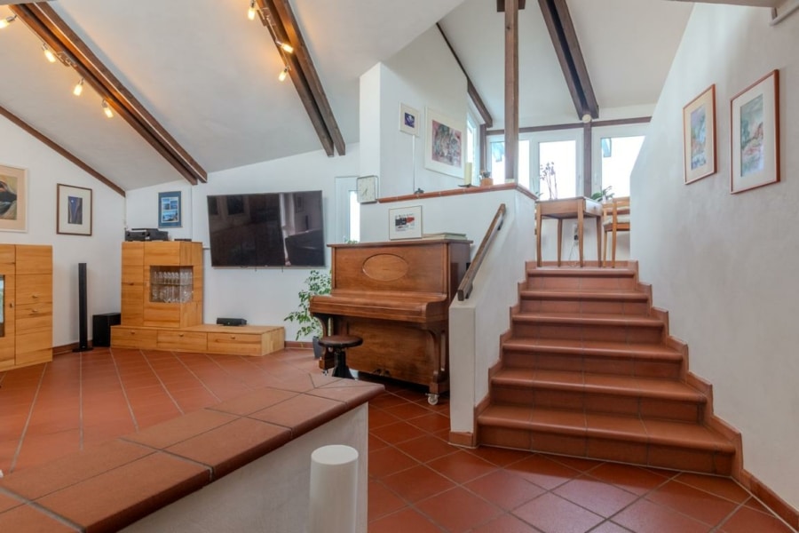 Der Hauptbereich lässt sich ohne großen Aufwand mit dem Einlieger-/Ferienwohnungsbereich über die innenliegende Treppe wieder verbinden.