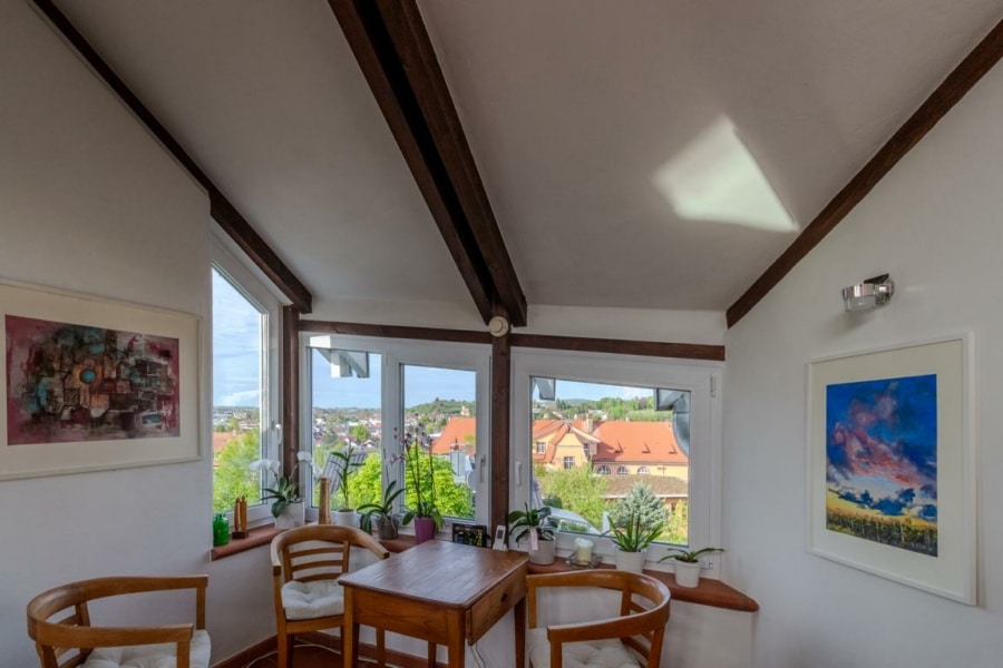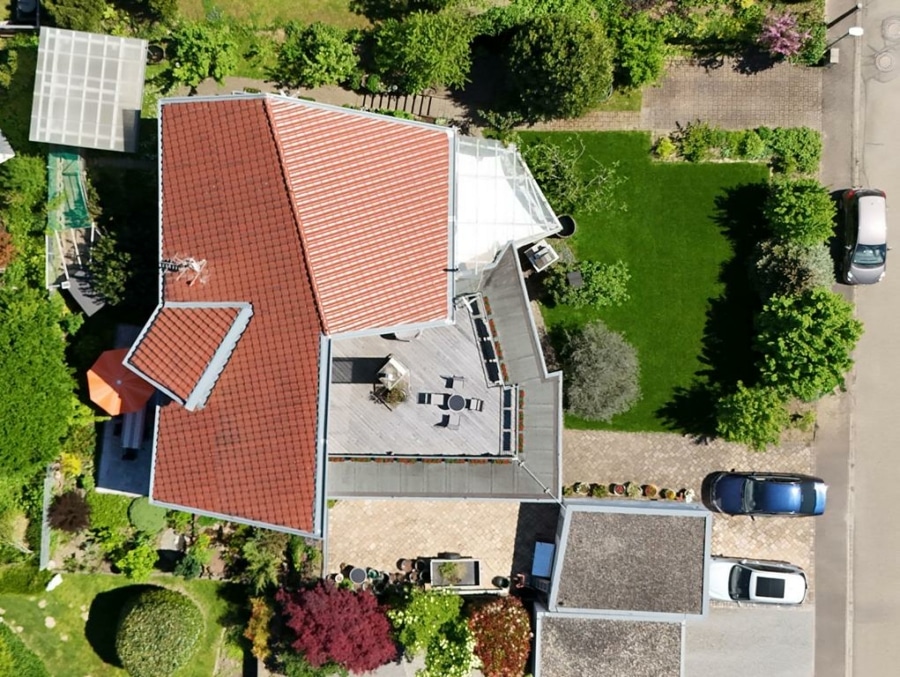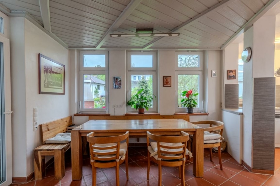 Der komfortable Essbereich mit angrenzender, überdachter Süd-Terrasse, bietet viel Platz, um kulinarische Feste mit Familie und Freunde zu genießen. Der Garten ist liebevoll und vielfältig angelegt, mit Blumenbeeten, Sträuchern, Bäumen und einem kleinen Wasserlauf. Verschiedene Sitzgelegenheiten harmonieren gekonnt mit dem Gartenkonzept.
