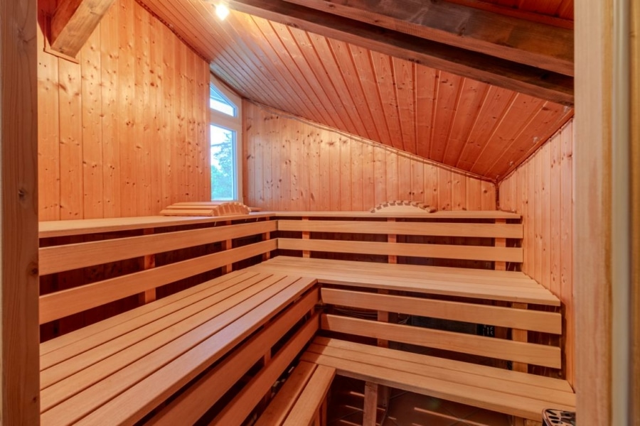 Ein Wellnessbereich mit Sauna und großem Badezimmer bietet Ihnen und Ihren Gästen die Gelegenheit, nach einem langen Tag zu entspannen. Der Heiz- und Technikraum rundet diese Etage ab.
