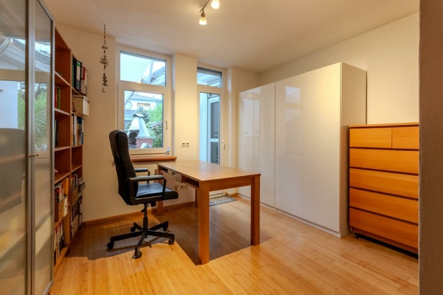 Auf dieser Etage befinden sich ein voll ausgestattetes Tageslichtbad mit Waschmaschinenanschluss. Ein Schlafzimmer mit Balkon sowie zwei weitere Zimmer (z. B. Kinder-, Arbeits- oder Gästezimmer) bieten vielfältige Nutzungsmöglichkeiten. Die beiden Räume ermöglichen zudem einen weiteren Zugang zur Süd-Terrasse. Ein Gäste-WC im Eingangsbereich rundet das Raumangebot dieser Ebene harmonisch ab.
