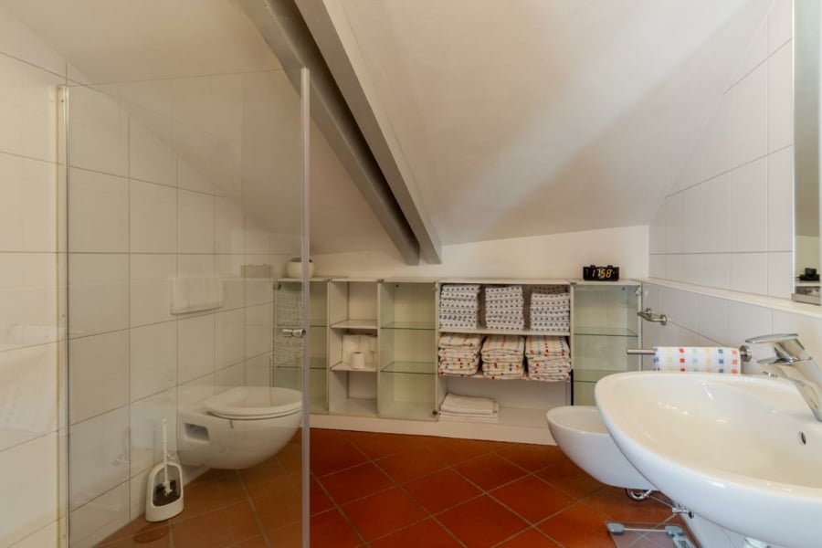 Über eine Außentreppe am hauseigenen Wasserlauf entlang, gelangen Sie in das Hanggeschoss. Hier erwartet Sie eine Einlieger- bzw. Ferienwohnung mit Wohnzimmer, drei gut geschnittenen Zimmern, voll ausgestattete Küche, einem Badezimmer und einer praktischen Abstellkammer.