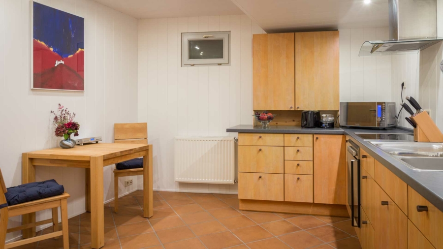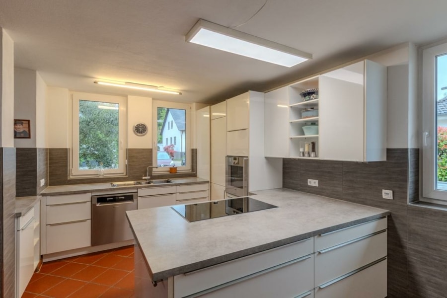 Die moderne Einbauküche, die im Kaufpreis enthalten ist, erfüllt alle Ansprüche: stilvoll, funktional und großzügig ausgestattet mit viel Stauraum, großem Kühlschrank und jeder Menge Tageslicht.
