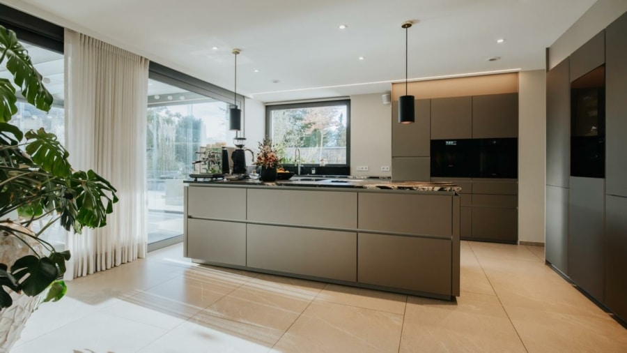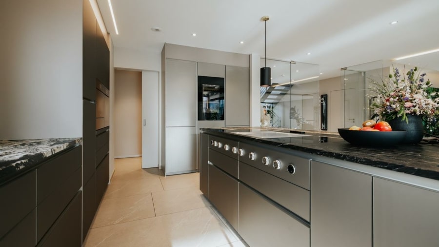 Die offen gestaltete Küche überzeugt durch eine zeitlose Linienführung, hochwertige Materialien und eine ruhige Farbwahl. Großzügige Arbeitsflächen, eine Kücheninsel und flächenbündige Einbauten sorgen für ein aufgeräumtes Gesamtbild. Ausgestattet mit einem Bora Professional Kochsystem inklusive Tepan-Edelstahlgrill und Echtstein-Arbeitsplatte erfüllt sie höchste Ansprüche. Bodentiefe Fenster verbinden den Kochbereich mit dem Außenbereich; zudem besteht ein direkter Zugang zur Garage und zum Abstellraum.