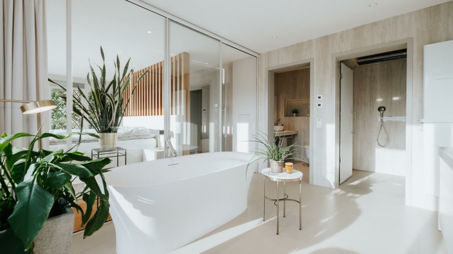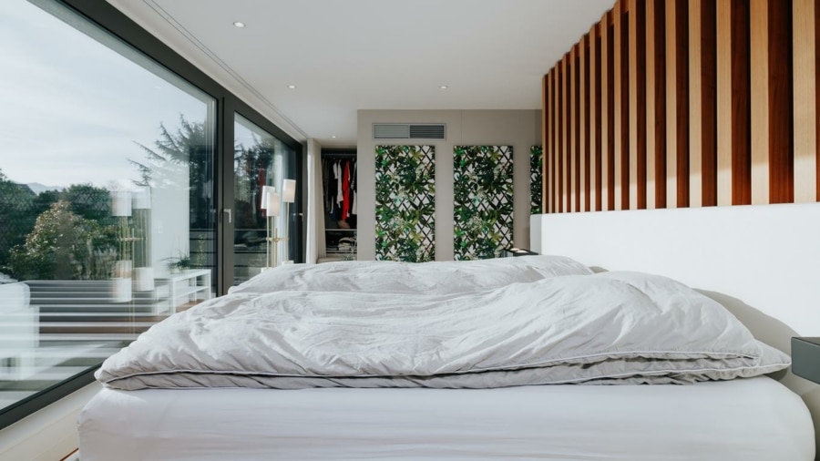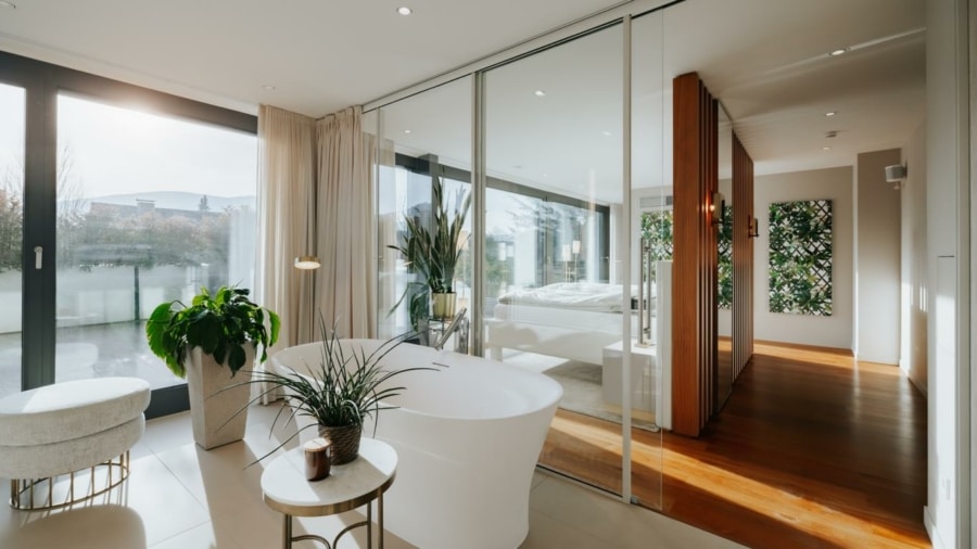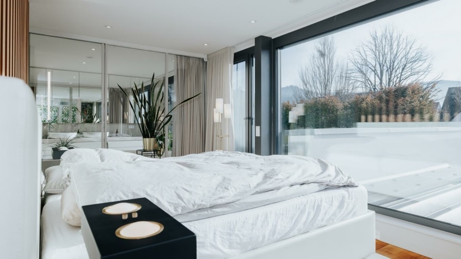 Das Highlight dieser Etage bildet das Elternschlafzimmer. Das Bett ist optimal nach außen ausgerichtet und eröffnet bereits am Morgen einen Blick ins Freie. Angrenzend befinden sich das Ankleidezimmer mit maßgefertigten Einbauschränken sowie das elegante Badezimmer, das durch eine Glaswand mit dem Schlafzimmer verbunden ist. Das außergewöhnliche Badezimmer überzeugt mit freistehender Badewanne, Mehrzonen-Regenwalddusche, Dampfbad mit Aromatisierung, beheizbarer Sitzbank sowie separatem WC mit Duschfunktion. Vom Badezimmer aus gelangen Sie zusätzlich auf einen Balkon.
