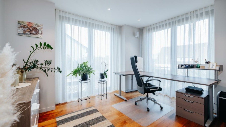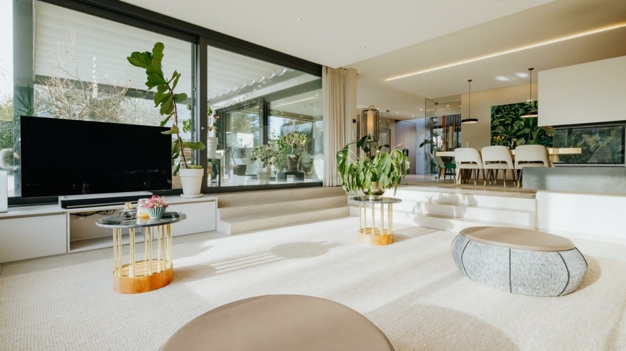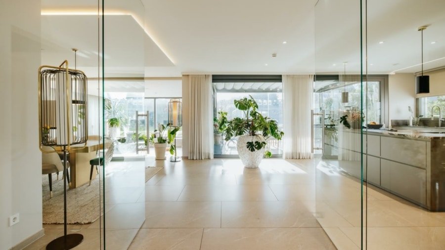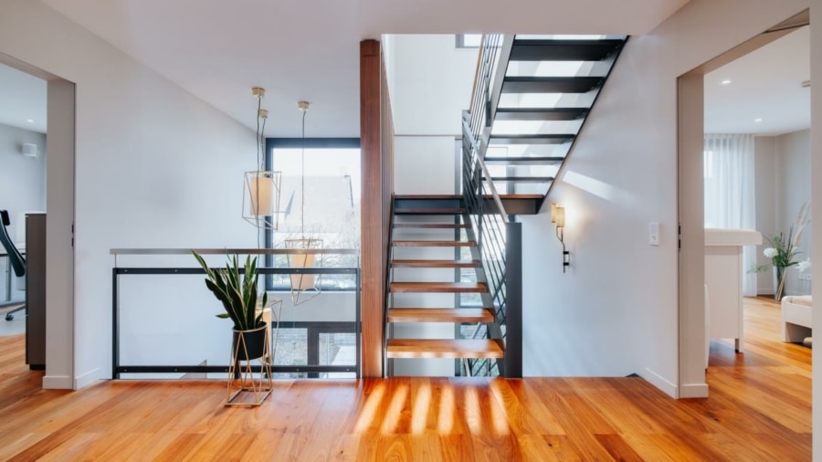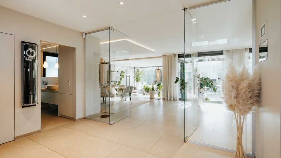 Im Eingangsbereich empfängt Sie eine klare, moderne Gestaltung. Maßgefertigte Einbauschränke und eine integrierte Garderobe bieten viel Stauraum, während offene Blickachsen, Glasflächen und die offene Treppe für eine helle Atmosphäre sorgen. Durch eine großzügige Glasfront gelangen Sie in den lichtdurchfluteten Wohn- und Essbereich. Die transparente Trennung bewahrt die Offenheit des Grundrisses und sorgt zugleich für eine angenehme Strukturierung der Räume.