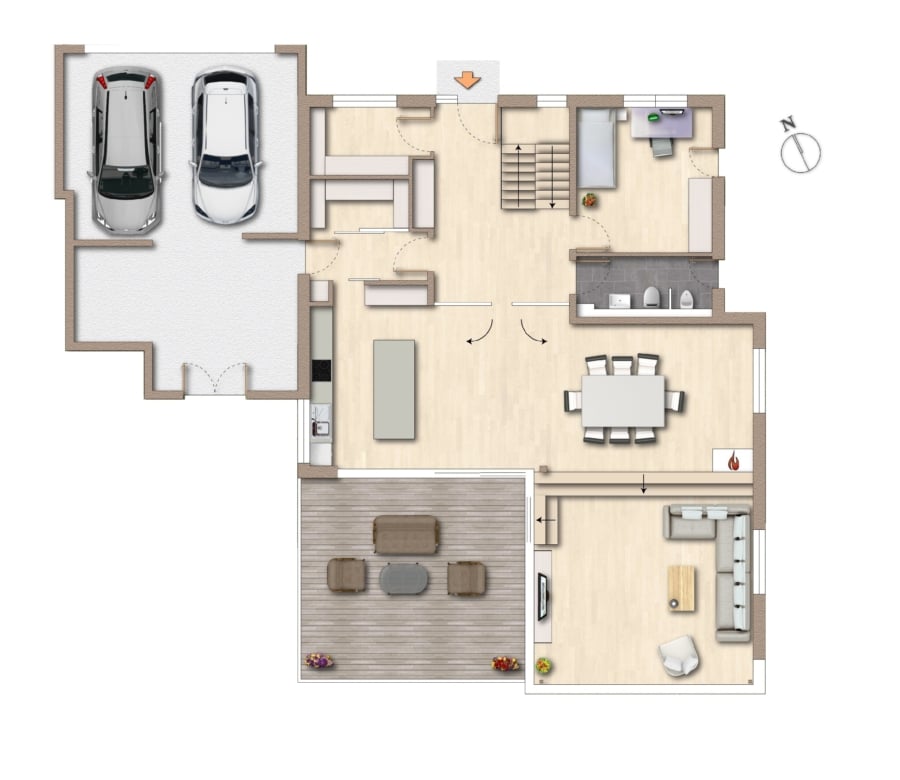Die angrenzende Doppelgarage verfügt über eine integrierte Elektroladestation. Das Untergeschoss bietet großzügige Stauflächen, eine Waschküche mit Wäscheabwurfschacht, einen separaten Fitnessraum sowie einen Weinkeller.