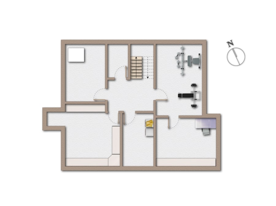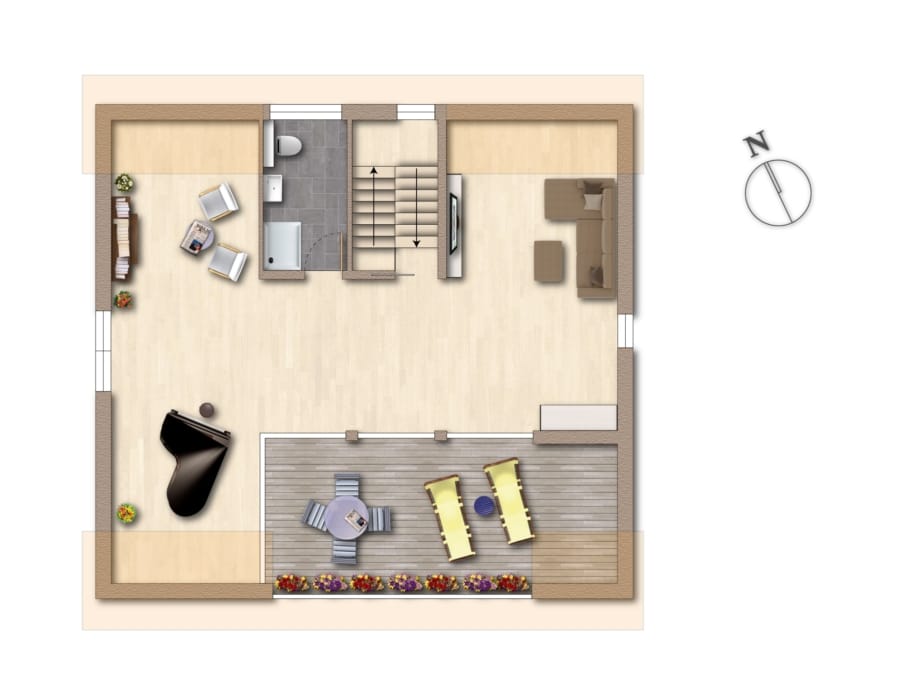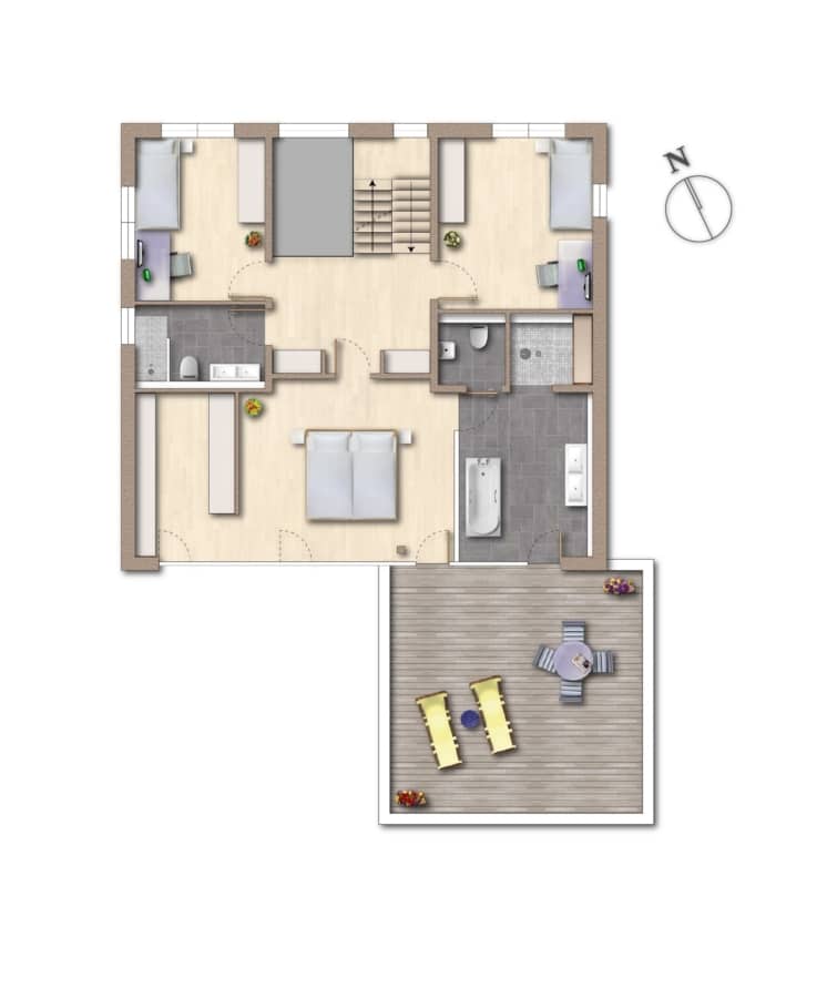 Das Obergeschoss bildet den privaten Rückzugsbereich der Familie und umfasst neben dem großen Elternschlafbereich ein Kinderzimmer, ein flexibel nutzbares Büro- oder Gästezimmer sowie ein Badezimmer mit begehbarer Dusche.