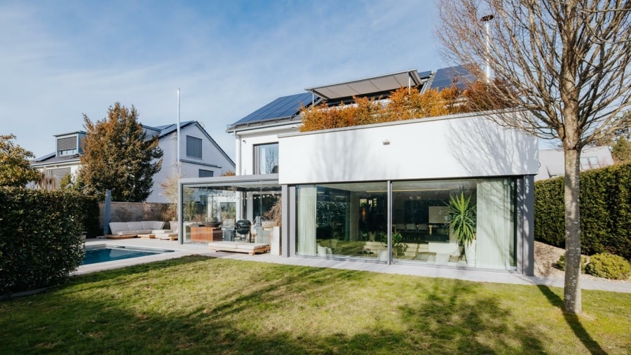 Technisch ist das Haus durchdacht ausgestattet und auf Komfort, Effizienz und Sicherheit ausgelegt. Eine aktive Wohnraumbelüftung, Fußbodenheizung im gesamten Haus (ausgenommen Keller und Weinkeller), Klimatisierung im Dachgeschoss und im Schlafzimmer sowie eine Geothermie-Heizung mit mehreren Erdbohrungen sorgen für ein angenehmes Raumklima. Ergänzt wird dies durch eine Photovoltaikanlage mit Speicher, ein KNX-Bussystem (Hager), dimmbare und smart steuerbare Lichtsysteme, ein Sonos-Soundsystem sowie ein umfassendes Alarm- und Überwachungssystem.