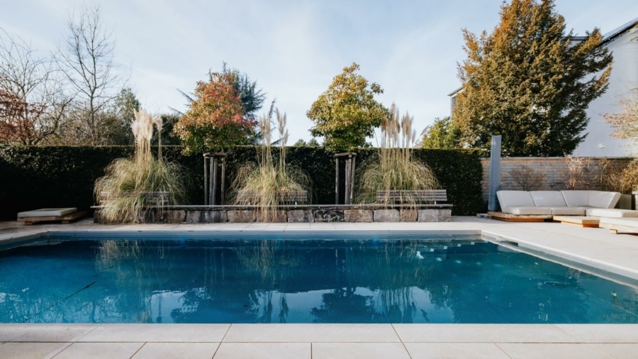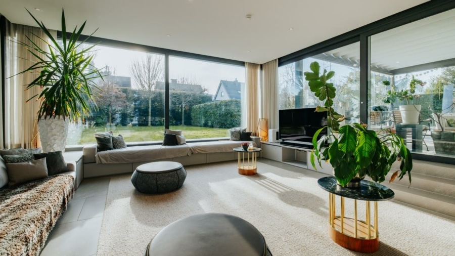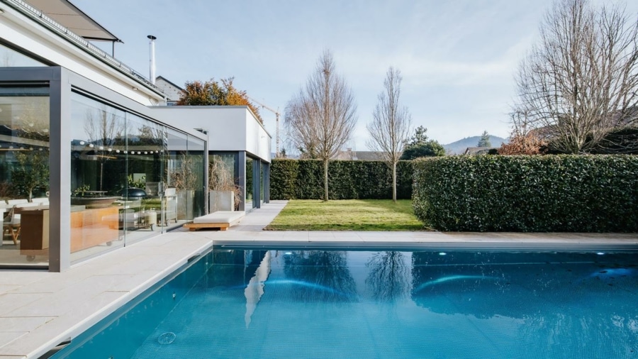 Vom Essbereich aus führen wenige Stufen hinab in den großzügigen Wohnbereich. Die leichte Niveauverschiebung verleiht dem Raum Tiefe und Struktur. Eine großzügige Sofalandschaft, bodentiefe Fensterflächen mit Blick in den Garten sowie der offene Kamin schaffen eine warme, einladende Atmosphäre. Von hier aus gelangen Sie direkt auf die Terrasse und die angrenzende Pergola. Der liebevoll gestaltete Garten präsentiert sich als geschützter Rückzugsort mit hohem Maß an Privatsphäre. Ein elegant integrierter Edelstahlpool sorgt an warmen Tagen für Erfrischung, während eine separate Sauna den Wellnesscharakter des Anwesens unterstreicht.
