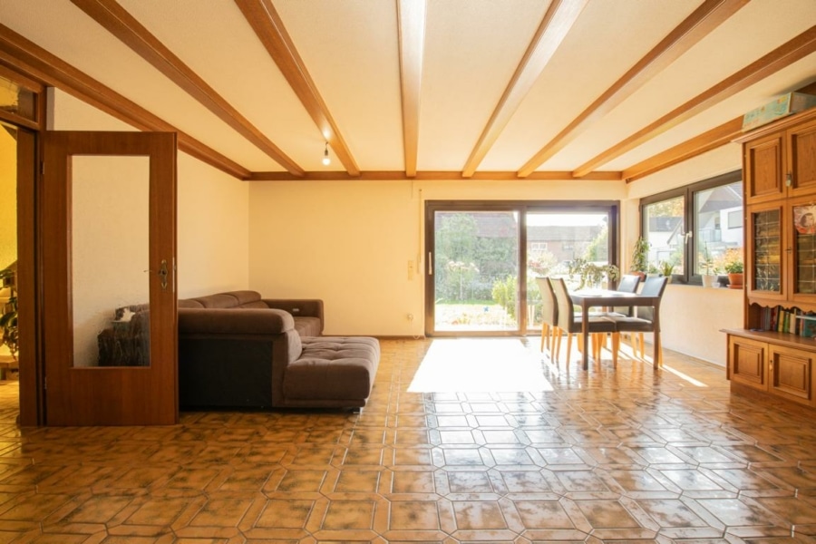Im Erdgeschoss erwartet Sie über wenige Stufen der Eingangsbereich des Einfamilienhauses. Der zentrale Mittelpunkt der Etage ist der große Wohnbereich mit angrenzendem Kaminzimmer. Von hier aus gelangen Sie auf die Südterrasse und in den Garten, wo Sie entspannte Stunden im Freien verbringen können. Die separate Küche mit Essbereich grenzt direkt an den Wohnbereich an. Die Einbauküche ist im Kaufpreis enthalten. Ein separates Gäste-WC rundet das Raumangebot im Erdgeschoss ab.
