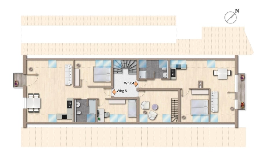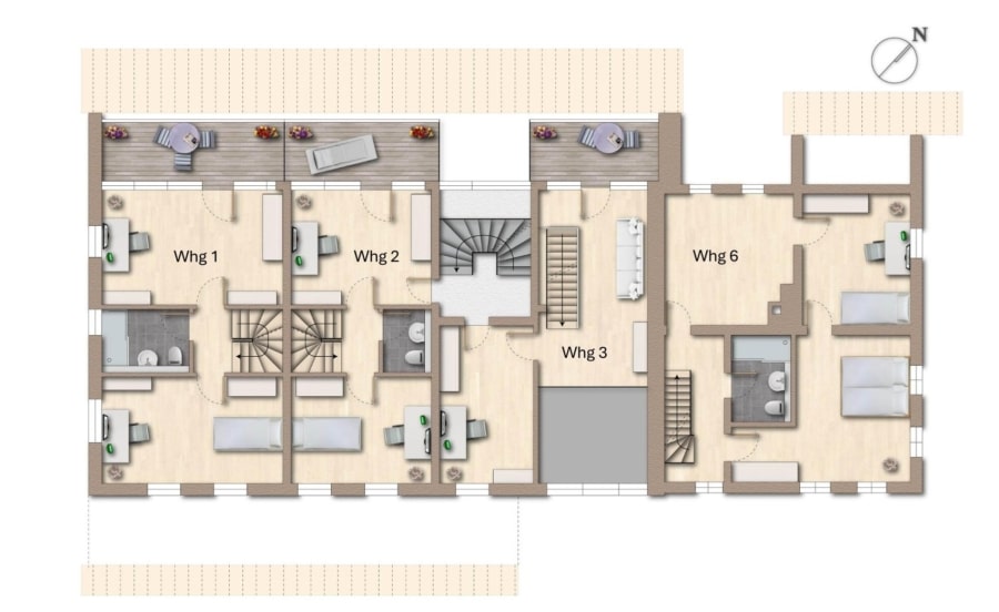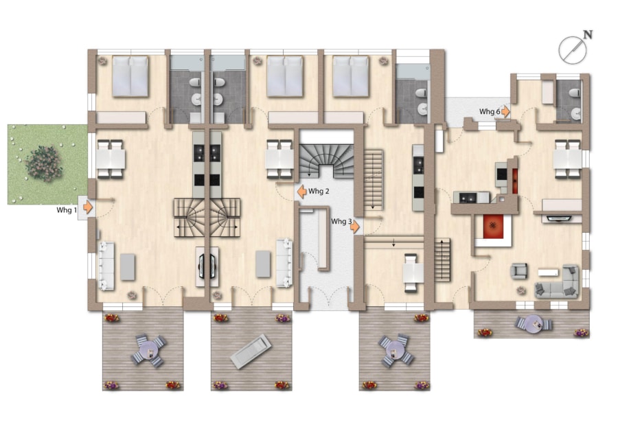 Das Haus umfasst sechs großzügige Wohneinheiten, darunter vier Maisonette-Wohnungen, die sich vom Erd- ins Obergeschoss erstrecken und durch offene Raumkonzepte, Lichtdurchflutung und Flexibilität ein besonders angenehmes Wohngefühl vermitteln: