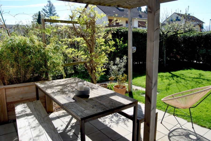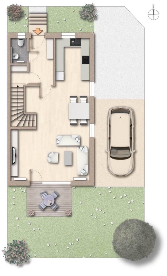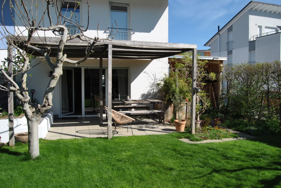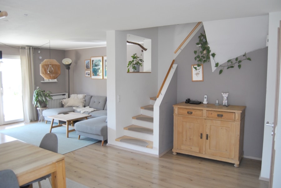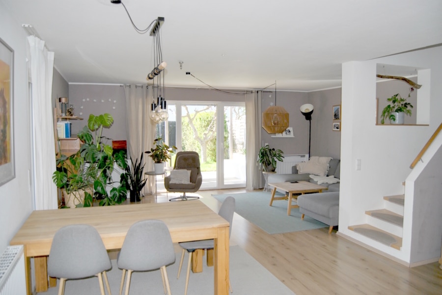 Im Erdgeschoss erwartet Sie ein großzügiger Wohn- und Essbereich mit offener Küche, der durch seine Helligkeit und Offenheit besticht. Die Küche ist funktional eingerichtet und im Kaufpreis enthalten. Vom Wohnzimmer aus gelangen Sie direkt auf die Terrasse sowie in den Garten mit Pergola – ein perfekter Ort für entspannte Stunden im Freien. Ergänzt wird diese Ebene durch ein praktisches Gäste-WC.