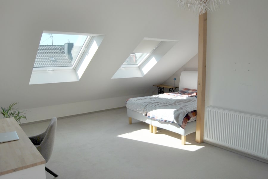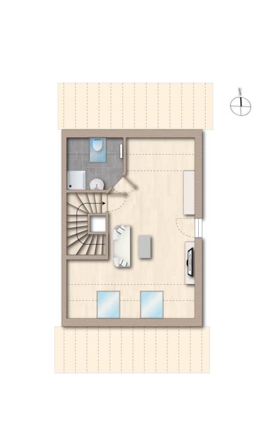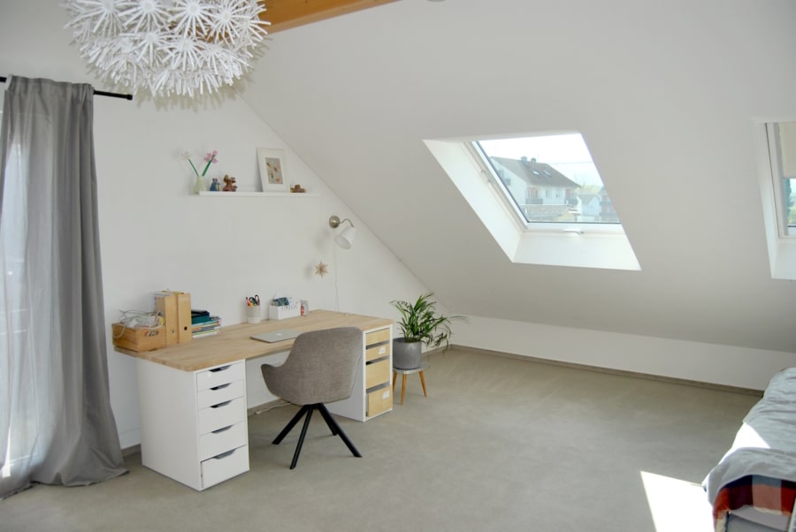 Im ausgebauten Studio befindet sich das großzügige Elternschlafzimmer mit eigenem Duschbad, wodurch ein privater Rückzugsort geschaffen wird. Die gemütlichen Dachschrägen verleihen dem Raum dabei eine besonders behagliche Atmosphäre und unterstreichen den wohnlichen Charakter dieses Rückzugsortes.