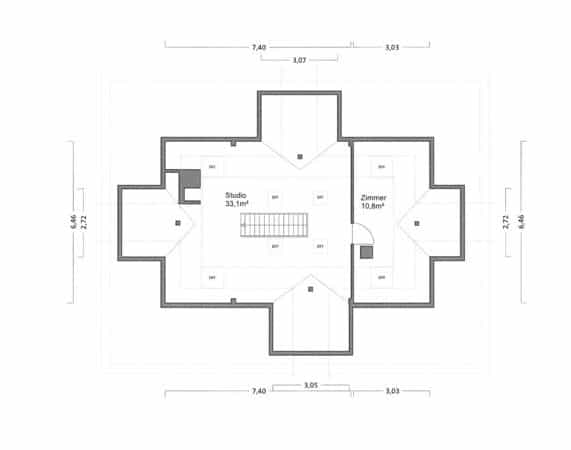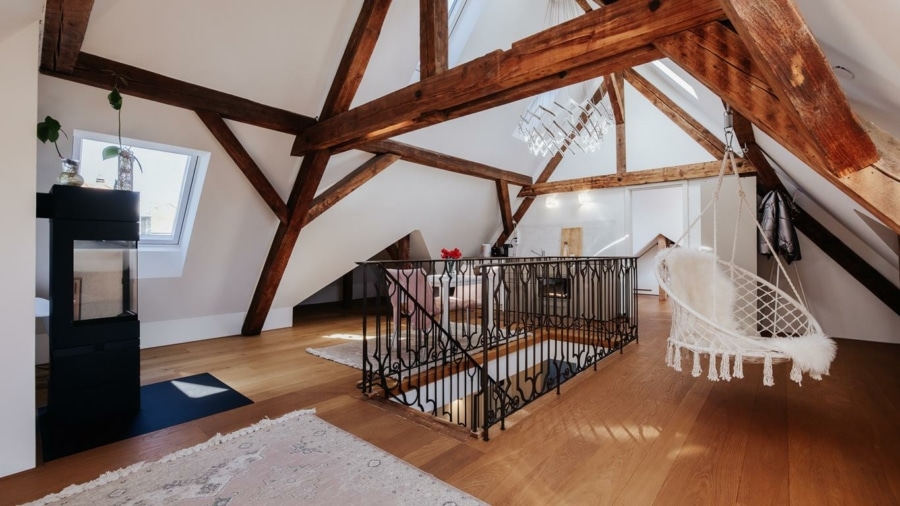 Der ausgebaute Dachspitz mit offenem Sichtgebälk und offener Galerie beherbergt ein weiteres Zimmer (z.B. Gästezimmer, Au-Pair Zimmer) mit eigener Küchenzeile und Kamin – ein idealer Rückzugsort.