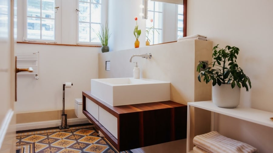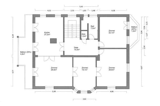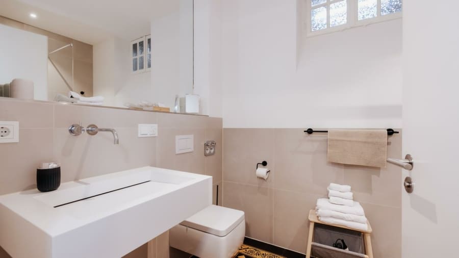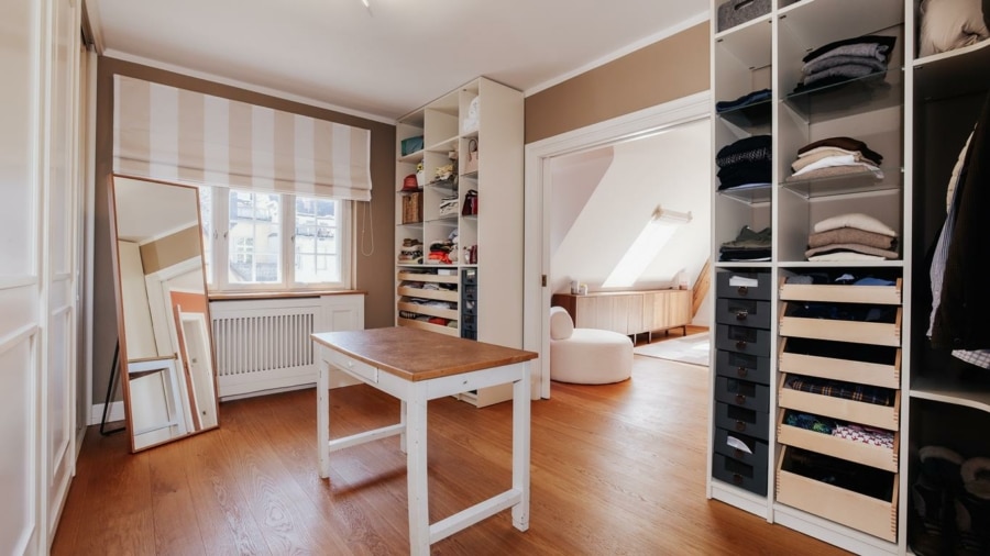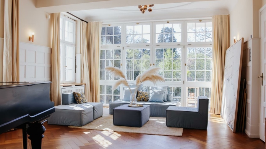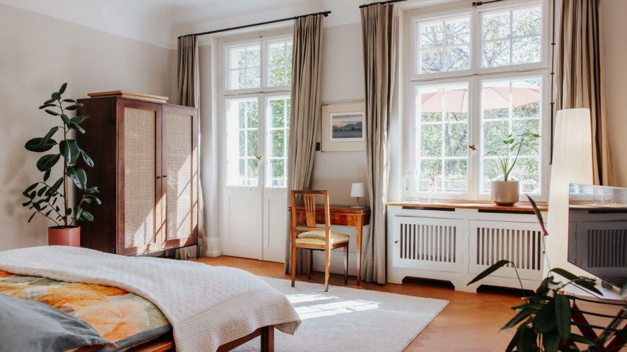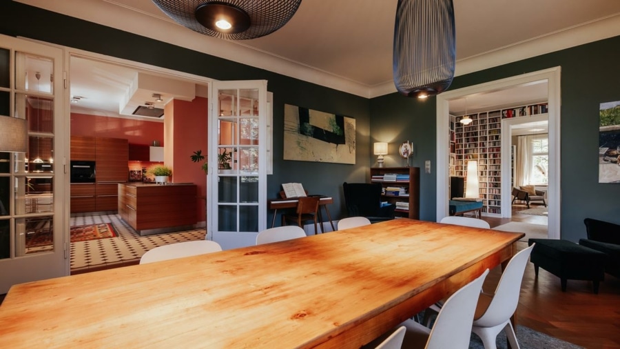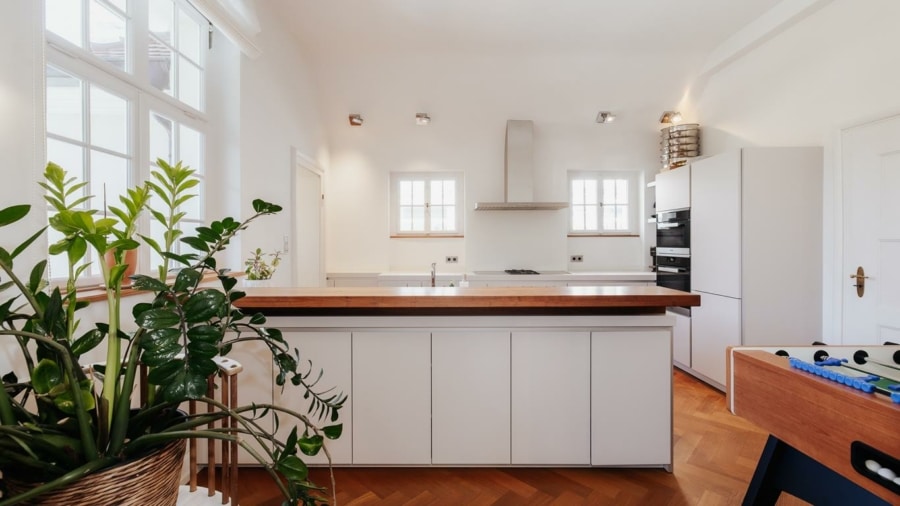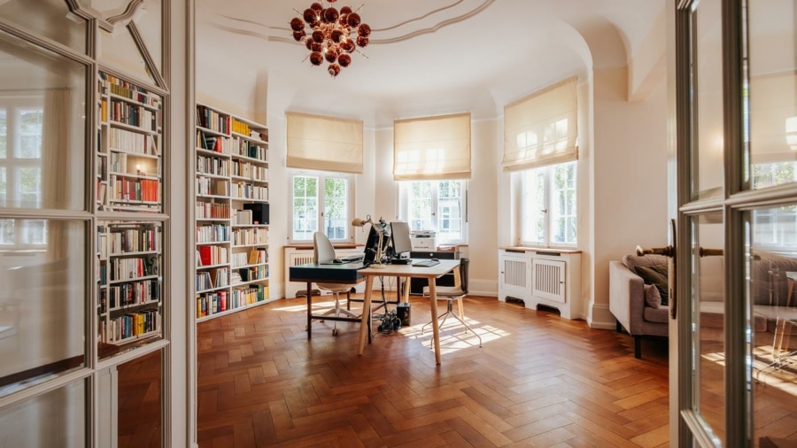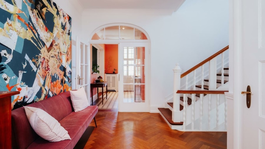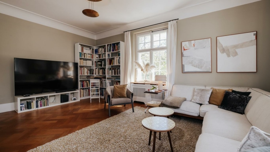 Auch bei der Auswahl der Materialien spiegelt sich der hohe Anspruch an Ästhetik und Qualität wider: Im Erdgeschoss unterstreicht ein hochwertiges Fischgrätparkett die repräsentative Ausstrahlung der Wohnräume. Dieser edle Parkettboden zieht sich stilvoll in das Obergeschoss. In Küche und Badezimmer wurden sorgfältig ausgewählte Jugendstilfliesen verlegt. Die Wohnräume im Dachgeschoss und im Dachspitz sind mit geölten Echtholzdielen aus Eiche ausgestattet. Alle Bäder und die Hauptküche sind mit einer Fussbodenheizung ausgestattet. Alle fünf Küchen sind von bulthaup.