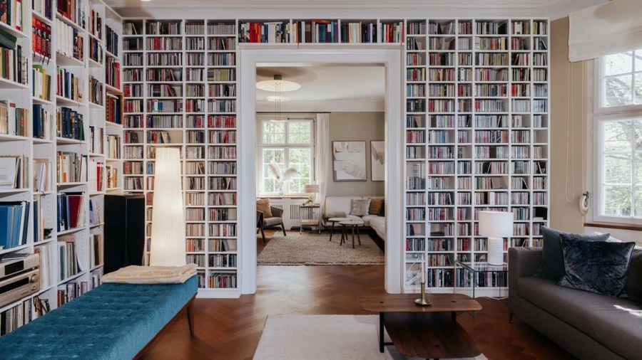 Das Holztreppenhaus führt in die oberen Etagen des Hauses. Im Obergeschoss befindet sich ebenfalls eine moderne Einbauküche (Hauptküche) mit angrenzendem Esszimmer. Von beiden Räumen gelangen Sie auf den sonnigen Balkon. Hohe Flügeltüren unterstreichen die Eleganz der Räume und der Bibliothek mit dem Wohnzimmer. Ein helles Gästezimmer mit eigenem Balkon und dazugehörigen Tageslichtbad runden diese Etage optimal ab.