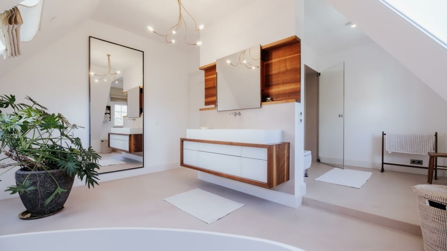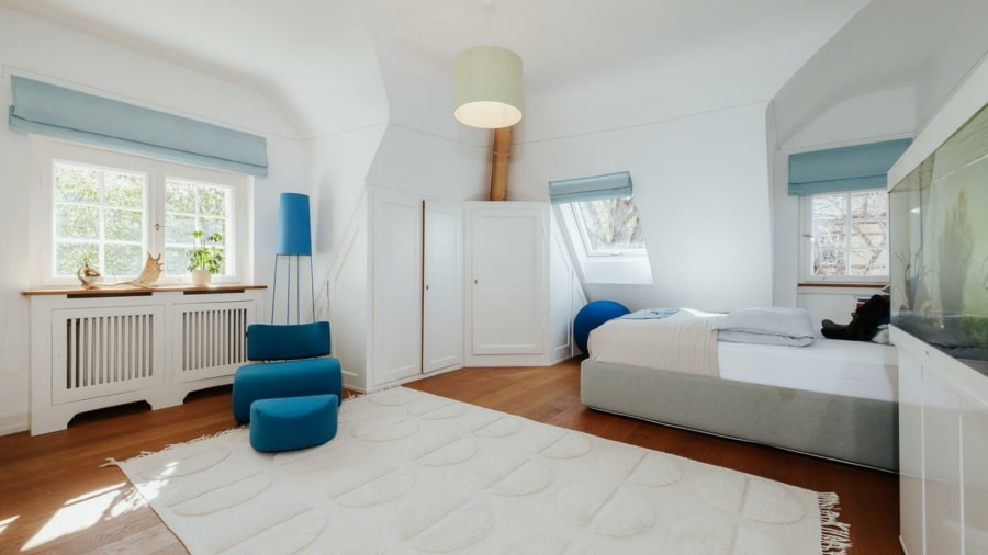 Familienfreundlich und komfortabel präsentiert sich das Dachgeschoss mit zwei geräumigen Kinderzimmern und einem eigenen, modernen Badezimmer (eingerichtet von Flagstone/Hamburg). Das private Schlafzimmer-Ensemble überzeugt mit eigenem Ankleidezimmer sowie großzügigem, luxuriösem Badezimmer mit freistehender, italienischer Designer-Badewanne, großer Regendusche/effegibi-Dampfdusche/Hamam und zahlreichen stilvollen Details.