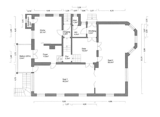 Vom Eingangsbereich gelangen Sie ins derzeitige Arbeitszimmer und das große Musikzimmer mit großflächiger Fensterfront – ein idealer Ort für kreative Stunden oder gesellige Abende – zudem für eine gewerbliche Nutzung (Architekturbüro, Praxis, Kanzlei) gestattet. Der sonnige Balkon mit direktem Zugang in den Garten erweitert den Raum ins Freie. Angrenzend liegt die helle und moderne Einbauküche (Sommerküche, Empfangsküche). Ein Gäste-WC, ein Windfang sowie ein Abstellraum vervollständigen das großzügige Raumangebot auf dieser Ebene.