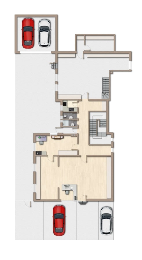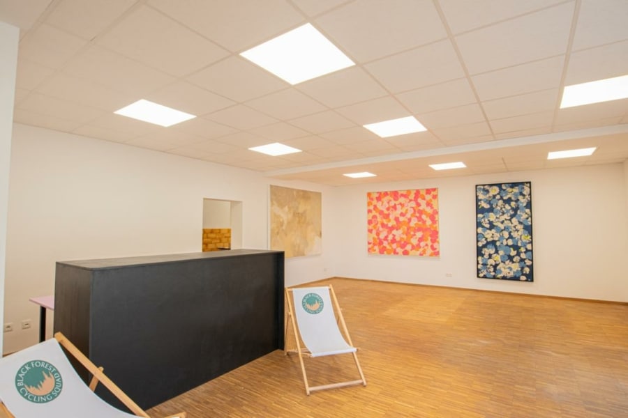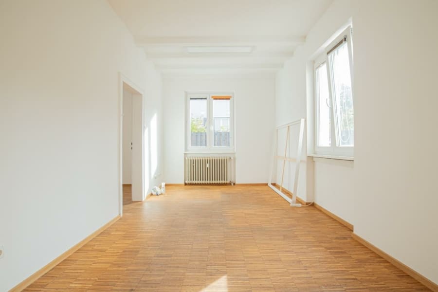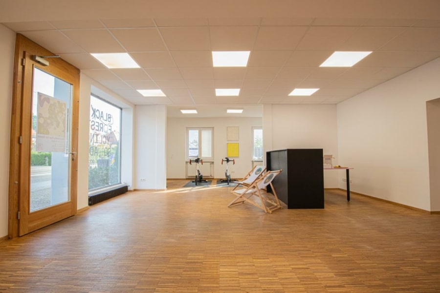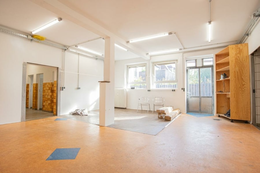 Der vordere Bereich wurde modernisiert und präsentiert sich freundlich und hell: Ein großzügiger Verkaufsraum mit Fensterfront sowie zwei kleinere, mit Stabparkett ausgestattete Räume eignen sich ideal als Büro-, Empfangs- oder Beratungsflächen. Dieser Bereich kann bei Bedarf auch separat abgetrennt werden – beispielsweise als Verkaufs- oder Kundenbereich – während die hinteren Räume als Lager, Werkstatt oder Produktionsflächen genutzt werden können.