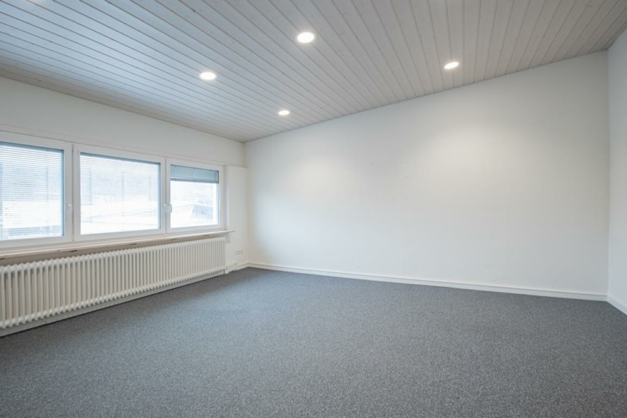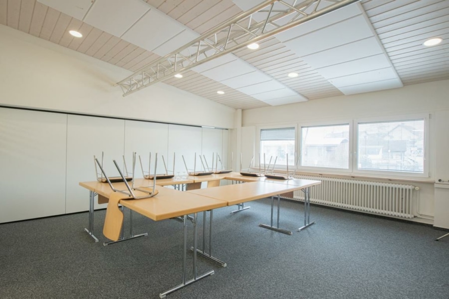 Das Obergeschoss überzeugt mit hellen, großzügig geschnittenen Büro- und Konferenzflächen. Dank der flexiblen Raumstruktur lassen sich diese ohne größeren Aufwand an alternative Nutzungskonzepte – möglicherweise als Fitness- oder Büro- /Schulungsbereich – anpassen.