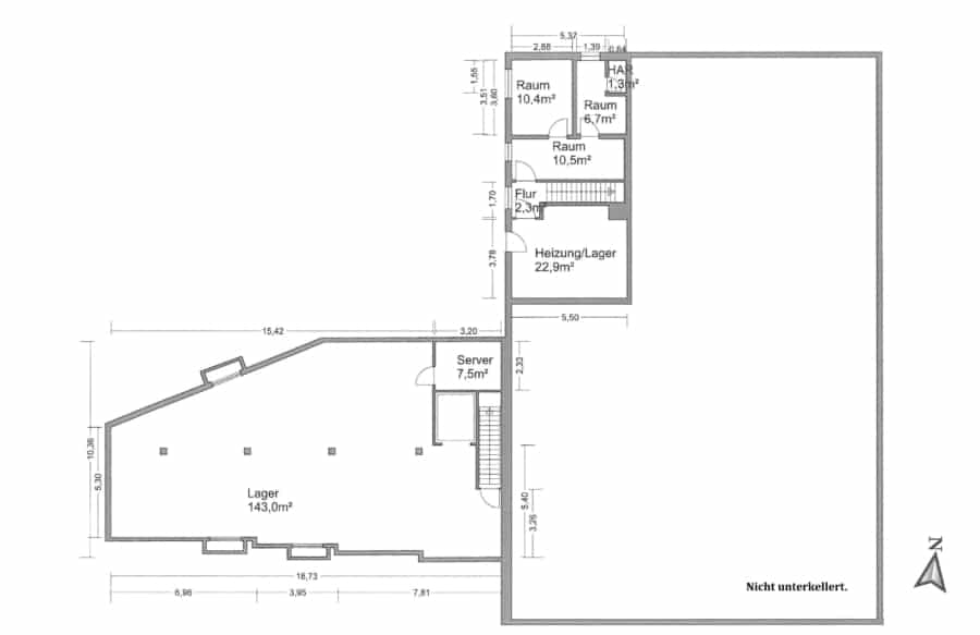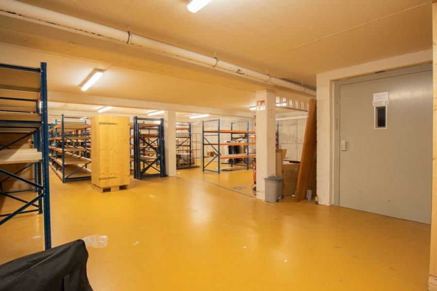Der einladende Eingangsbereich im Erdgeschoss schafft bereits beim Betreten des Gebäudes einen positiven und weitläufigen ersten Eindruck. Die Immobilie ist teilweise unterkellert und bietet zusätzlichen Lagerraum verbunden mit einem Lastenaufzug. Ein weiterer Lastenaufzug verbindet das Erdgeschoss mit dem Obergeschoss.