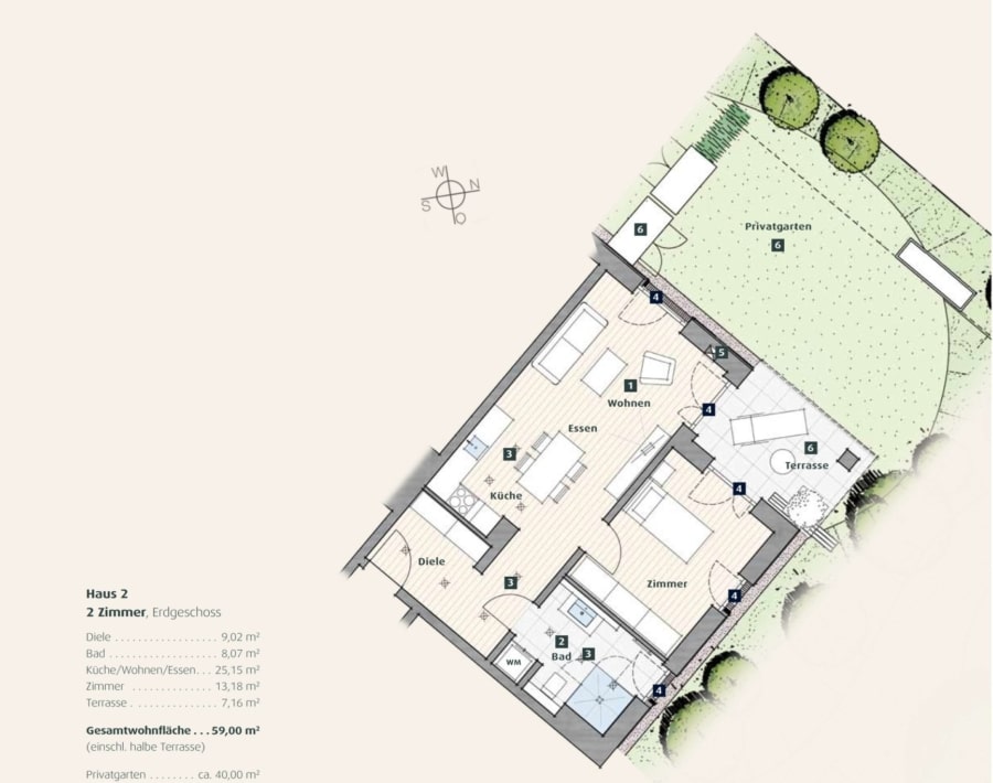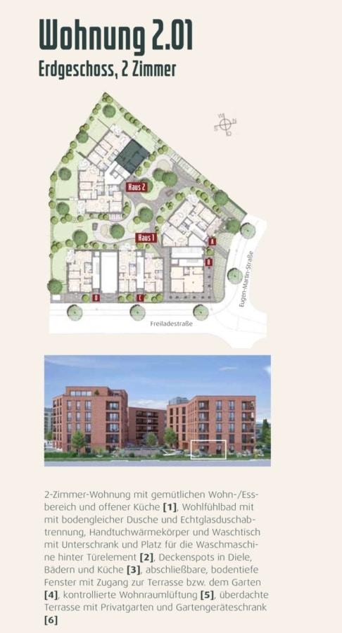 Bei diesem Angebot handelt es sich um eine ca. 59 m² große Wohnung (Nr. 2.01 im Erdgeschoss von Haus 2 mit 2 Zimmern