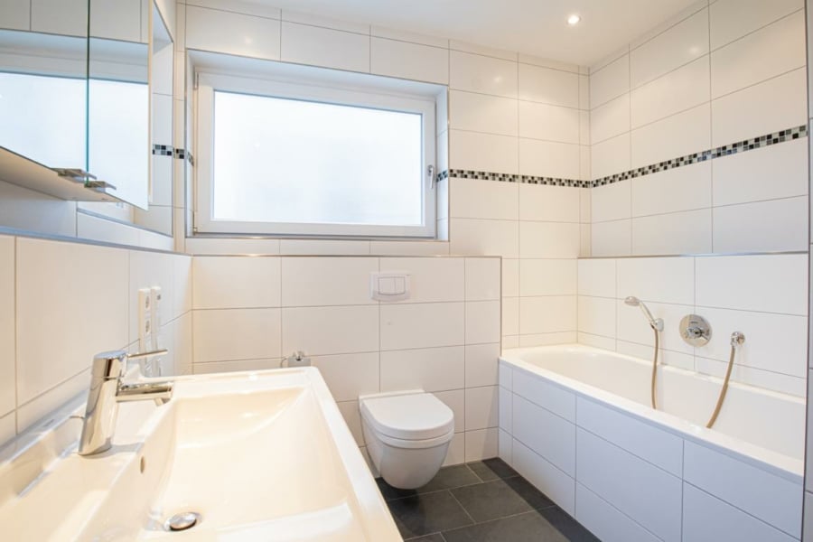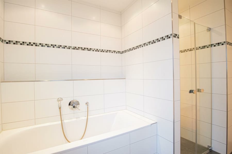 Das Tageslichtbad ist mit einer begehbaren Dusche und einer Badewanne ausgestattet. Zusätzlich steht ein Gäste-Bad mit Dusche zur Verfügung, in dem sich auch der Waschmaschinenanschluss befindet. Eine Handtuchheizung sorgt hier für zusätzlichen Komfort.
