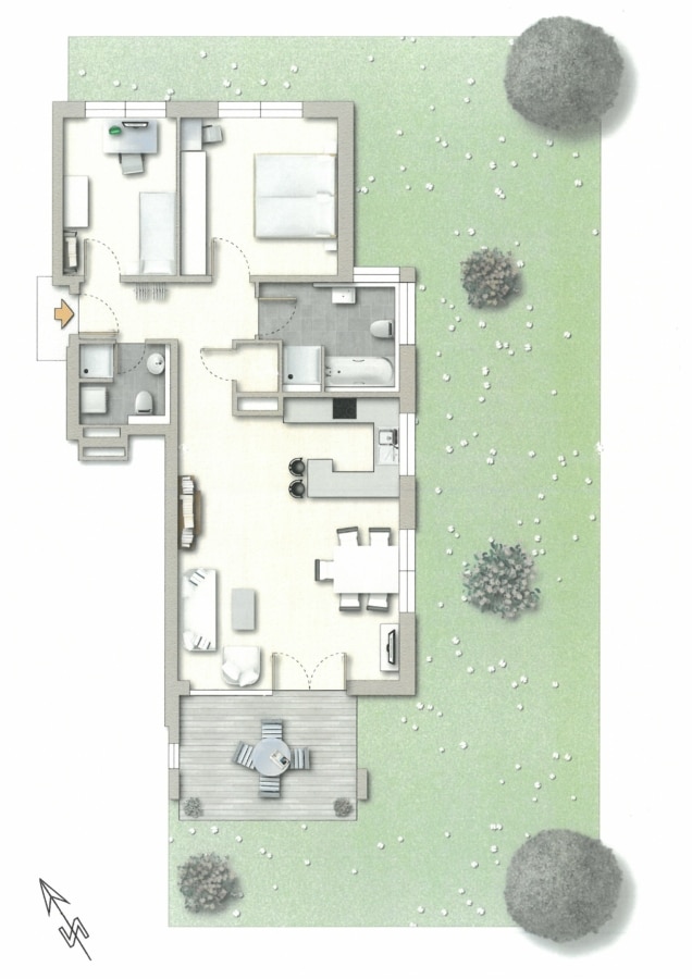 Ein besonderes Highlight ist der großzügige Garten (Sondernutzungsrecht), der mit seiner gewachsenen Bepflanzung zum Entspannen und Verweilen einlädt. Hier können Sie Ihre individuellen Gestaltungsideen verwirklichen.