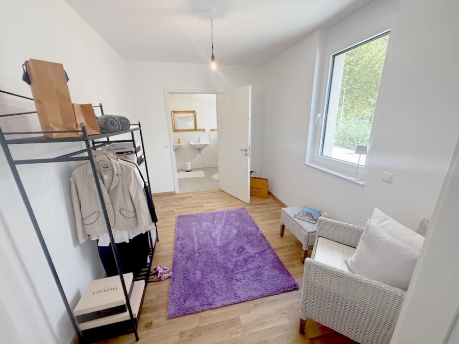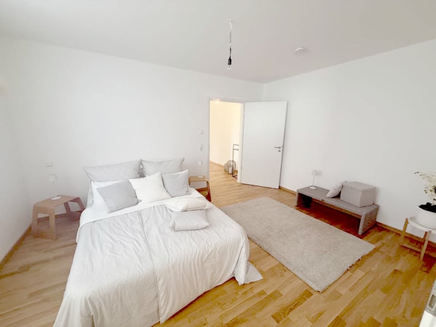 Das Schlafzimmer überzeugt durch Ruhe und Komfort und bietet eine praktische Ankleide oder alternativ einen Bürobereich. Das en-suite Bad ist mit Badewanne und Dusche ausgestattet und rundet das Wohlfühlkonzept harmonisch ab. Ergänzt wird die Wohnung durch einen Abstellraum sowie ein Gäste-WC, die zusätzlichen Stauraum und Funktionalität bieten. Ein Kellerraum sowie ein gemeinschaftlich genutzter Fahrrad- und Trockenraum vervollständigen das Angebot.