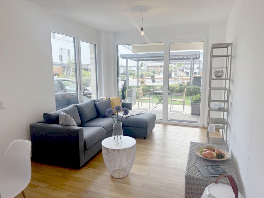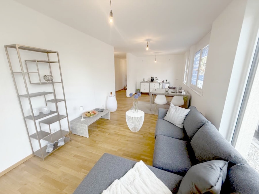 Diese schöne 2,5-Zimmer-Wohnung befindet sich im Erdgeschoss und verfügt über ca. 89,71 m² Wohnfläche. Der helle Eingangsbereich führt Sie direkt in den offenen Wohn-, Koch- und Essbereich – das Herzstück der Wohnung. Hier genießen Sie gesellige Abende, entspannte Stunden mit der Familie oder ruhige Momente zu zweit. Großzügige Fenster durchfluten die Räume mit Tageslicht und bieten direkten Zugang zur kleinen Terrasse sowie zum angrenzenden Garten – ein idyllischer Rückzugsort zum Entspannen.