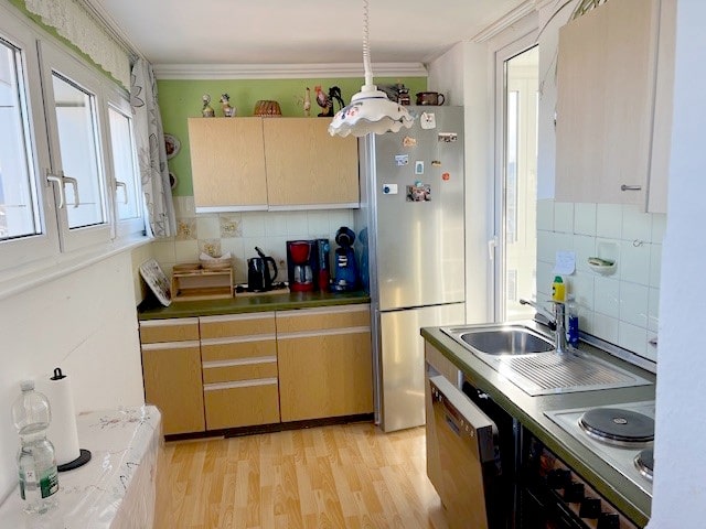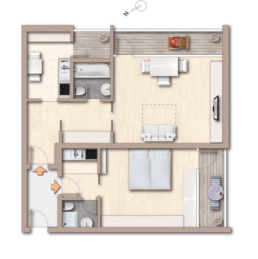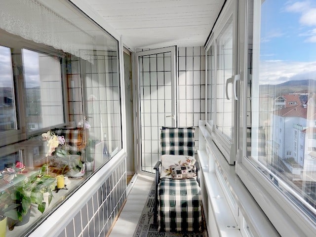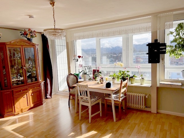 Die Wohnung verfügt über ein separates Schlafzimmer sowie ein Wohn- und Esszimmer mit angrenzender Küche, das als zentraler Lebensmittelpunkt dient. Drei verglaste Loggien erweitern den Wohnraum deutlich, schaffen zusätzliche Nutzfläche und sorgen für eine helle, freundliche Atmosphäre. Sie bieten vielseitige Nutzungsmöglichkeiten – ob als Leseecke oder geschützter Rückzugsort – sie sind nahezu ganzjährig nutzbar.