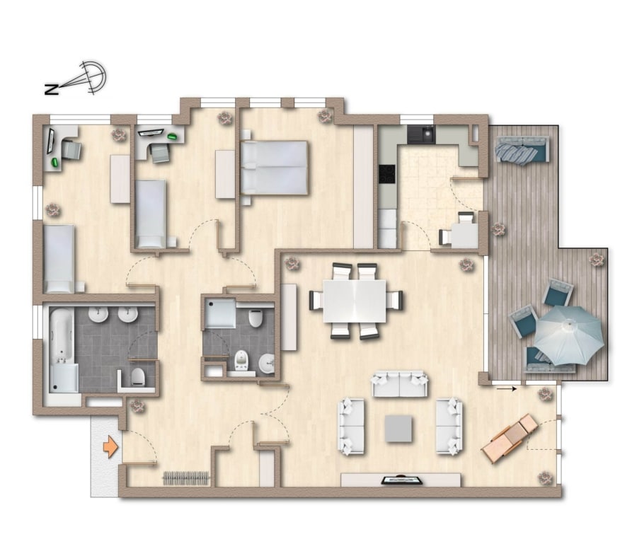Die beiden Bäder zeichnen sich durch großzügige Grundrisse und eine geschmackvolle Gestaltung aus. Das Tageslichtbad verfügt über eine Badewanne, eine separate Dusche, zwei Waschbecken sowie ein WC. Das zweite Bad ist mit Dusche und einem Waschmaschinenanschluss ausgestattet – für Gäste oder als zusätzliches Familienbad. Eine praktische Abstellkammer rundet das Raumangebot ab.